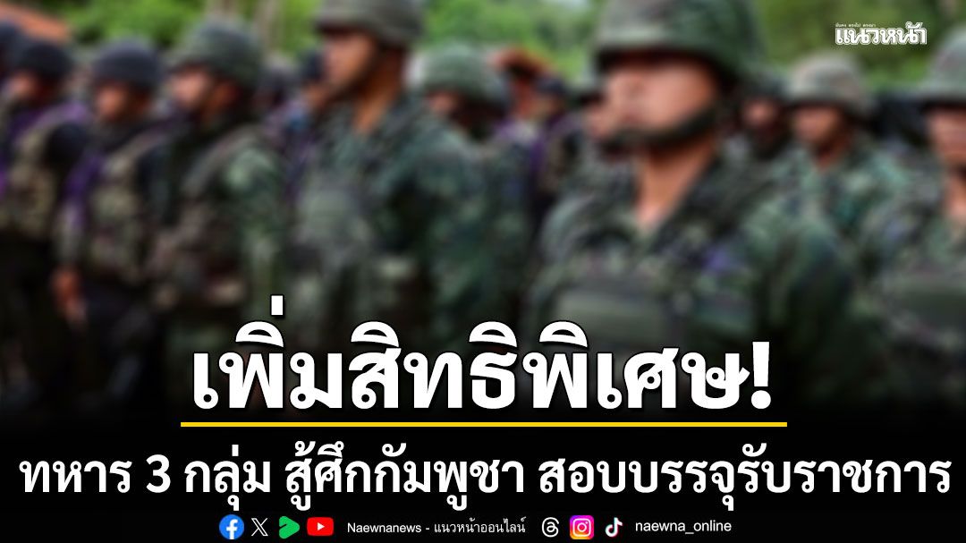 ผบ.ทบ. เพิ่มสิทธิพิเศษทหาร 3 กลุ่มสู้ศึกชายแดนไทย-กัมพูชา ตามคำสั่งจักรพงษ์ภูวนารถ บวกคะแนน15% ให้โควต้า สอบนายสิบ 156 อัตรา ส่วน กลุ่มบาดเจ็บ ได้สิทธิ์ นายสิบ 50 อัตรา บรรจุทหารชั้นประทวน 30 อัตรา