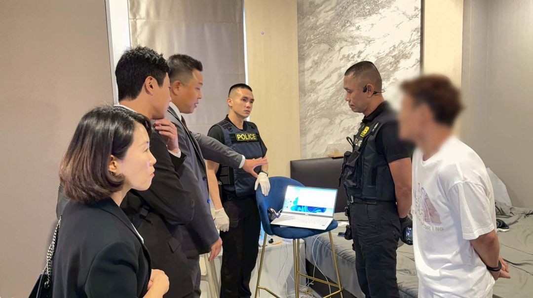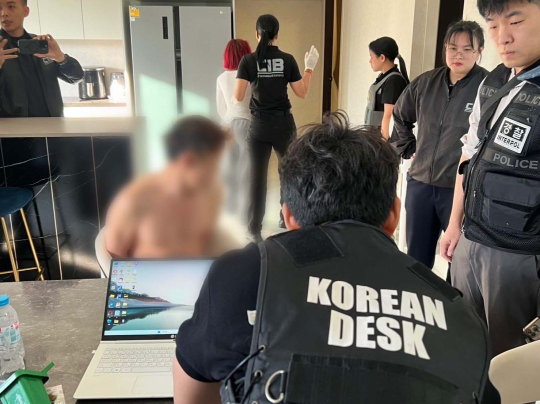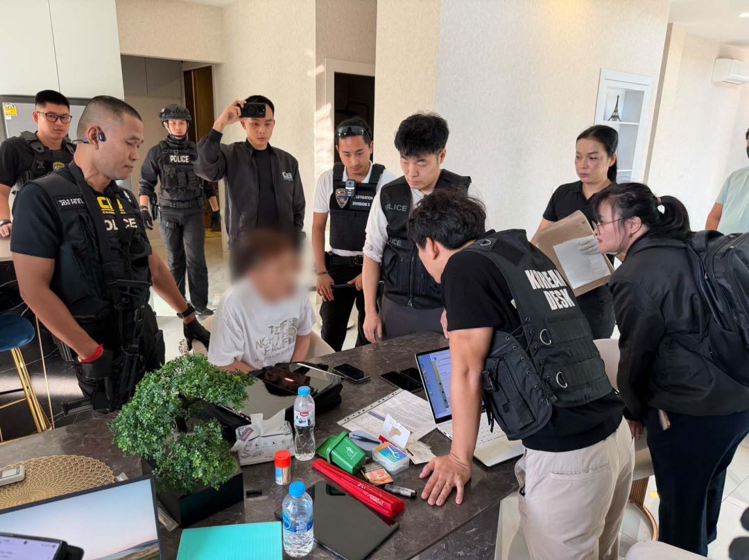 เจ้าหน้าที่ตำรวจ กก.1 บก.ปอท. พ.ต.ท.เอกพล แสงอรุณ, พ.ต.ท.ธีรภพ พันธุชาติ รอง ผกก.1 บก.ปอท., พ.ต.ท.ณัฐวุฒิ มาระตา รอง ผกก.(สอบสวน) กก.1 บก.ปอท., พ.ต.ท.หญิง หทัยชนก อินทรวิจิตร, พ.ต.ต.กษิดิศ ดิลกคุณานันท์ สว.กก.1 บก.ปอท.ร่วมกับเจ้าหน้าที่แผนกกงสุลตำรวจสถานเอกอัครราชทูตสาธารณรัฐเกาหลีประจำประเทศไทย, เจ้าหน้าที่ตำรวจ กลุ่มงานสนับสนุนฯ บก.ปอท. และเจ้าพนักงานตำรวจ กก.สืบสวน บก.ตม.จับกุมผู้ต้องหา 2 ราย ได้แก่ 1.นายฮัม (ชื่อเกาหลี) หรือ MR.XIAN (ผู้ต้องหาตามหมายจับตำรวจสากล หรือ Red Notice) ในความผิดฐานล่อลวงเพื่อส่งตัวไปต่างประเทศ ตามมาตรา 288 วรรคสาม ประโยคแรก และวรรคสองแห่งกฎหมายอาญาของสาธารณัฐเกาหลี มีอัตราโทษจำคุกตั้งแต่ 2 ปี 15 ปี และบังคับขู่เข็ญโดยมีลักษณะพิเศษ ตามมาตรา 324 วรรคสอง และวรรคหนึ่ง แห่งกฎหมายอาญาของสาธารณรัฐเกาหลี ฯลฯ” และ 2.นายเฉิน หรือ MR.CHEN ในความผิดฐาน “เสพยาเสพติดให้โทษประเภท 1 (เมทแอมเฟตามีน) โดยผิดกฎหมาย”