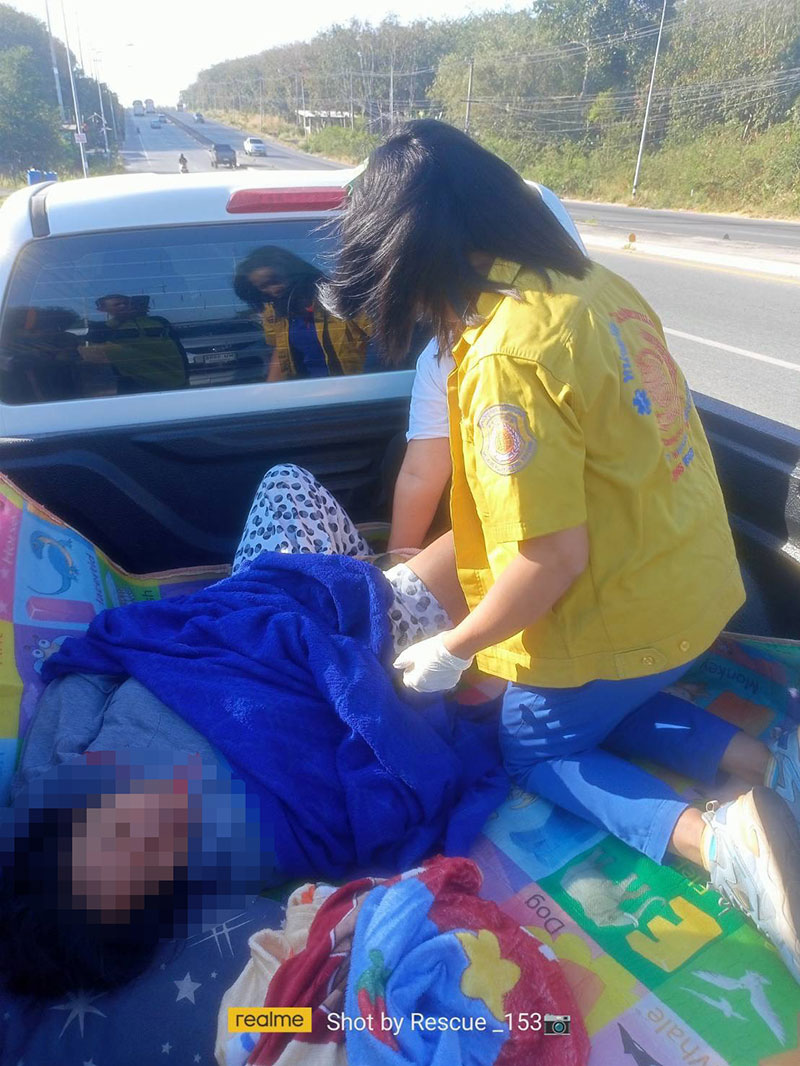ที่เกิดเหตุพบรถกระบะสีขาว ทะเบียน จอ-2653 ชลบุรี จอดอยู่ริมถนน ที่ท้ายรถกระบะคนงานชาวมอญ ประเทศเมียนมา ชื่อ น.ส.ดาว อายุ 30 ปี นอนรอยู่ท้ายรถกู้ภัยเร่งเข้าช่วยทำคลอดสำเร็จ ปรากฏได้ลูกชายร่างกายแข็งแรงดี จากนั้นกู้ภัยประสาน รถฉุกเฉินของโรงพยาบาลปลวกแดง มารับแม่และลูกไปดูแลต่อ ล่าสุดปลอดภัยทั้งแม่และลูก