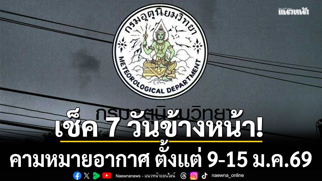 เมื่อเวลา 12.00 น.วันที่ 9 มกราคม 2569 กรมอุตุนิยมวิทยา คาดหมายอากาศทั่วไป พยากรณ์อากาศ 7 วันข้างหน้า ระหว่างวันที่ 9 -15 มกราคม 2569 ดังนี้
