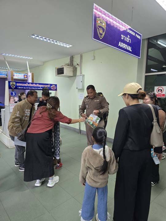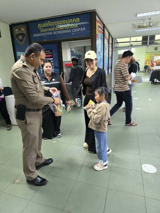 พ.ต.ท.ธวัชชัย มาติวงค์ พร้อมเจ้าหน้าที่ประจำจุดตรวจ ร.ต.อ.สำราญ ราชประโคน ร้อยเวรฯ ร่วมมอบของขวัญ ขนม ให้กับเด็กๆที่เดินทางเข้า-ออกราชอาณาจักร และได้รับการสนับสนุนกิจกรรมกับศุลกากรช่องเม็ก เปิดบูธอาหาร เครื่องดื่ม ให้เด็กๆบริเวณจุดตรวจ
