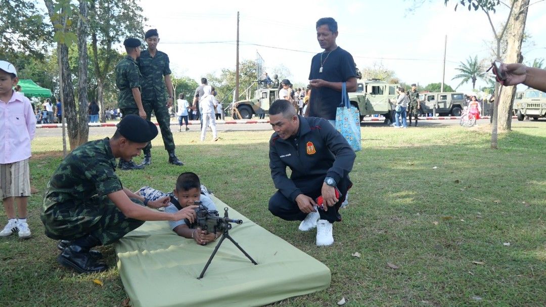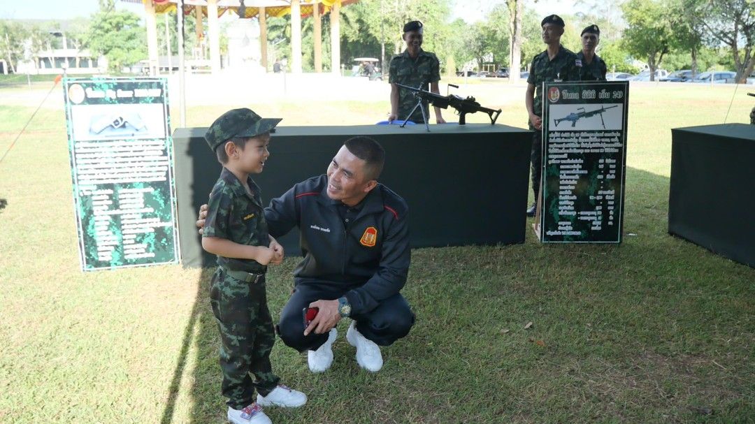พันเอกพงษ์เทพ แตงพลับ ผู้บังคับกองพันทหารราบที่ 4 กรมทหารราบที่ 15 เป็นประธานในพิธีเปิดงาน โดยไฮไลต์สำคัญที่ได้รับความสนใจจากเด็กๆ เป็นพิเศษ คือการนำอาวุธและยุทโธปกรณ์ทางทหารมาจัดแสดงให้ชมอย่างใกล้ชิด พร้อมเปิดโอกาสให้เด็กๆ ได้ทดลองสัมผัสและเรียนรู้วิธีการใช้งานเบื้องต้น โดยมีพี่ๆ ทหารคอยให้ความรู้และดูแลความปลอดภัยอย่างใกล้ชิด เพื่อสร้างแรงบันดาลใจและเปิดโลกทัศน์เกี่ยวกับการทำงานของรั้วของชาติ