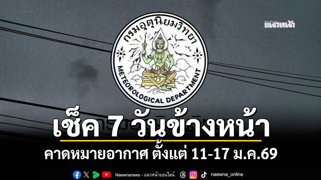เมื่อเวลา 12.00 น.วันที่ 11 มกราคม 2569 กรมอุตุนิยมวิทยา คาดหมายอากาศทั่วไป พยากรณ์อากาศ 7 วันข้างหน้า ระหว่างวันที่ 11 - 17 มกราคม 2569 ดังนี้