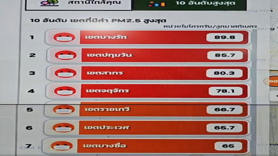 วันที่ 14 ม.ค. 69 นายชัชชาติ สิทธิพันธุ์ ผู้ว่าราชการกรุงเทพมหานคร ติดตามสถานการณ์ฝุ่น PM2.5 ในพื้นที่กรุงเทพฯ ณ ศูนย์ข้อมูลคุณภาพอากาศกรุงเทพมหานคร สำนักสิ่งแวดล้อม เขตดินแดง โดยกล่าวอัปเดตสถานการณ์ว่า วันนี้เป็นวันที่ กทม. ค่าฝุ่น PM2.5 น่าจะสูงที่สุดของปีนี้ โดยค่าฝุ่นสีแดงซึ่งมีผลกระทบต่อสุขภาพพบใน 4 เขต อยู่ในเขตกรุงเทพฯ ชั้นในทั้งหมด ได้แก่ บางรัก ปทุมวัน สาทร และจตุจักร ค่าฝุ่นประมาณ 80 ไมโครกรัมต่อลูกบาศก์เมตร (มคก./ลบ.ม.) ส่วนพื้นที่อื่นอยู่ในระดับสีส้ม เริ่มมีผลกระทบต่อสุขภาพทุกเขต ขอให้ประชาชนดูแลสุขภาพ หากออกไปข้างนอกควรสวมหน้ากากป้องกัน PM2.5 ลดกิจกรรมและการอยู่ในที่แจ้ง