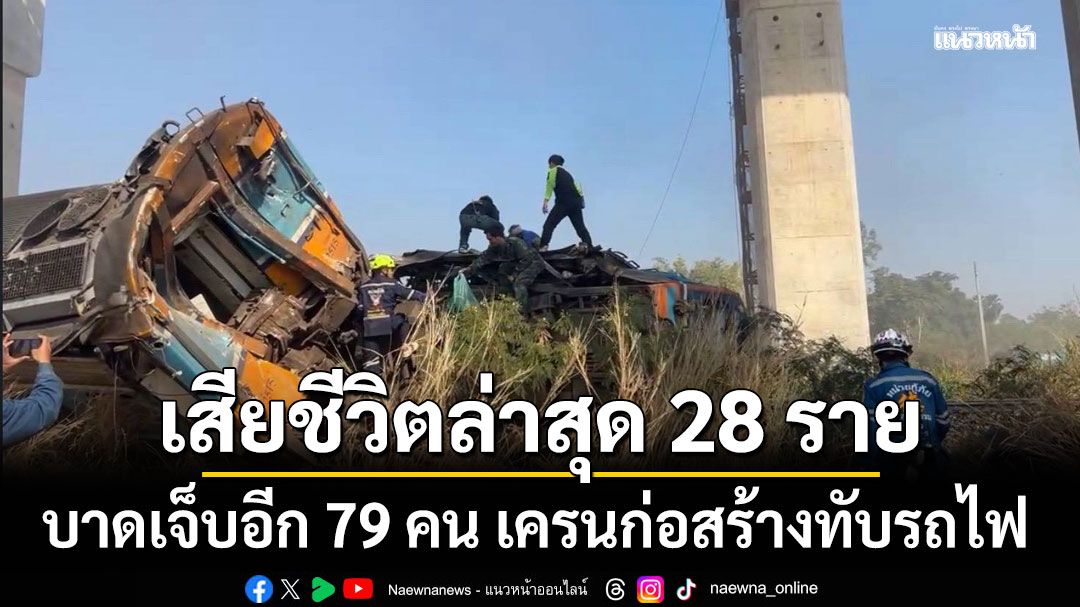 โคราชคืบหน้าเครนมรณะถล่มทับขบวนรถไฟปรับอากาศ ล่าสุดดับเพิ่มรวม 28 ราย บาดเจ็บ 79 ราย ยกเลิกชั่วคราวค้นหาร่างผู้เสียชีวิตโบกี้รถไฟพบเครนที่ถล่มยังมีอาการชำรุดหวั่นเกิดอุบัติเหตุกับทีมช่วยเหลือส่วน