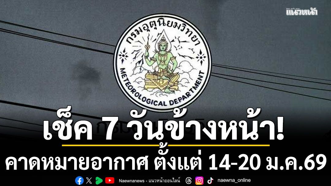 เมื่อเวลา 12.00 น. วันที่ 14 มกราคม 2569 กรมอุตุนิยมวิทยา คาดหมายอากาศทั่วไป พยากรณ์อากาศ 7 วันข้างหน้า ระหว่างวันที่ 14 - 20 มกราคม 2569 ดังนี้