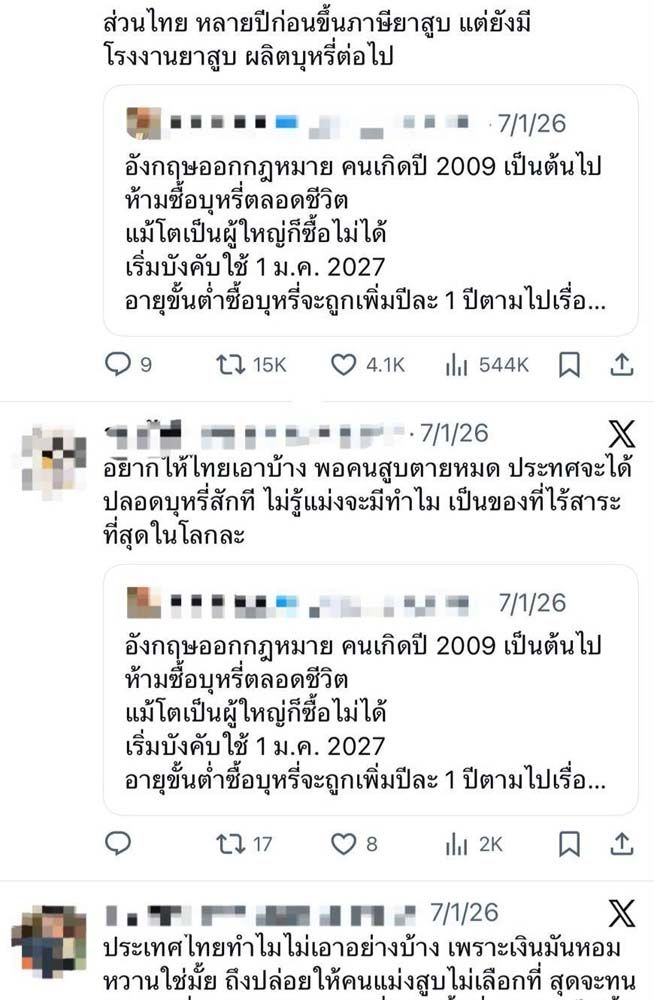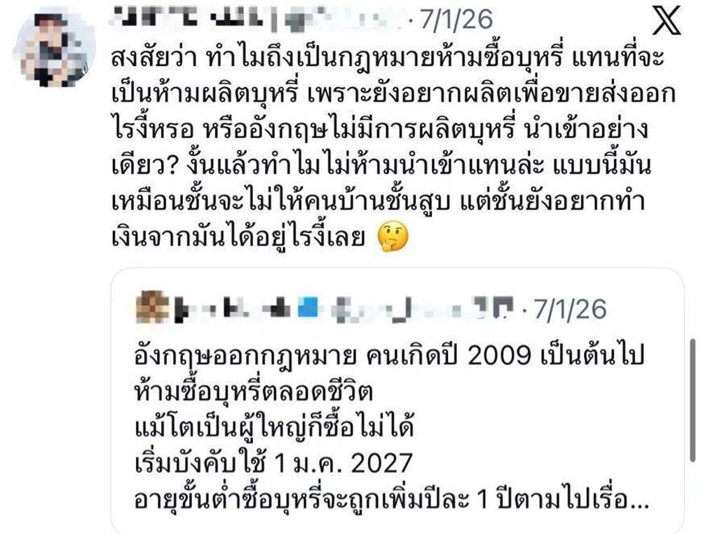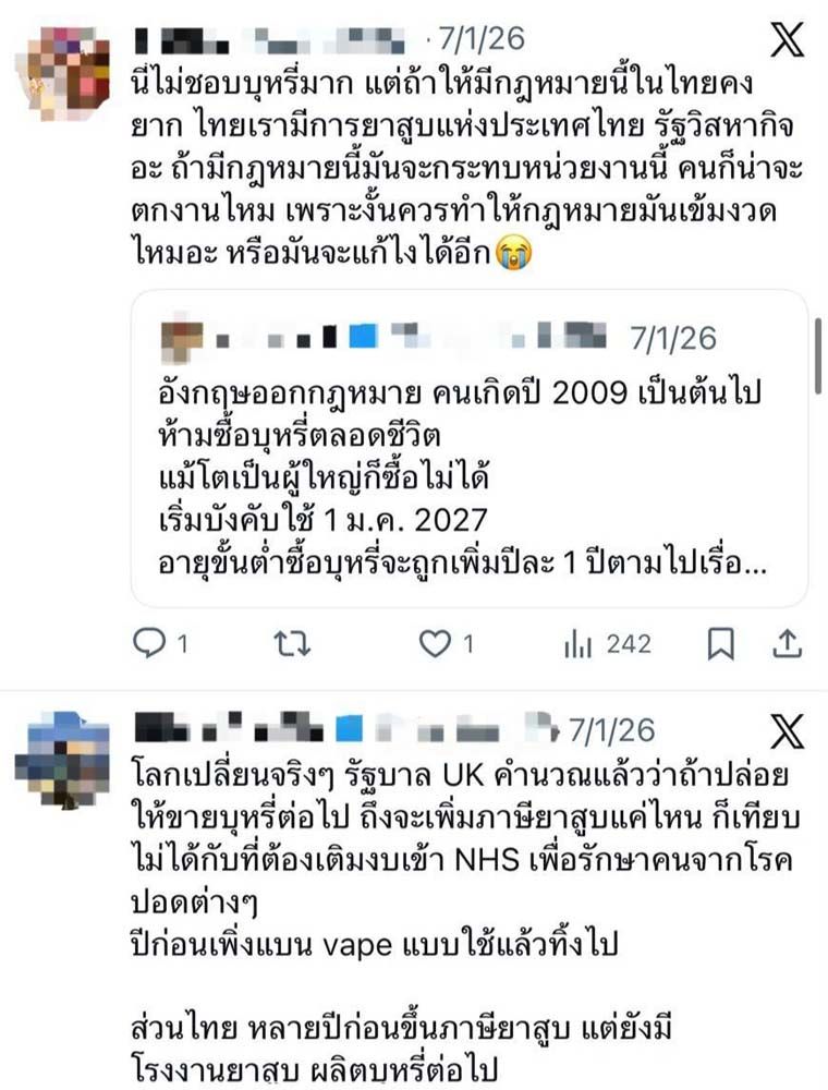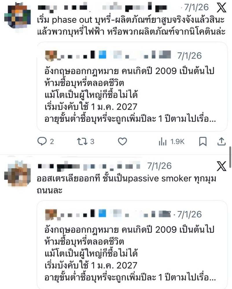 เครือข่ายผู้ใช้บุหรี่ไฟฟ้า เตือนสังคมอย่าเข้าใจผิด กรณีอังกฤษห้ามขายบุหรี่ให้ผู้ที่เกิดหลังปี พ.ศ. 2552 โดยยืนยันว่า นโยบายดังกล่าวมีผลเฉพาะบุหรี่มวน ไม่ครอบคลุมถึงบุหรี่ไฟฟ้าทุกประเภท พร้อมย้ำอังกฤษเน้นปกป้องเยาวชนแต่ยังให้ผู้สูบบุหรี่มีทางเลือก