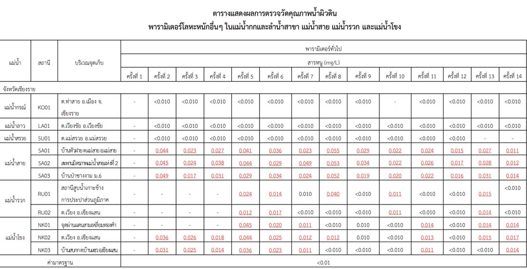 ผลการตรวจระบุว่าพบค่าโลหะหนัก เป็นไปตามมาตรฐานคุณภาพน้ำ ในแหล่งน้ำผิวดิน ยกเว้นค่าสารหนูพบเกินค่ามาตรฐานในแม่น้ำกก บริเวณสะพานมิตรภาพแม่นาวาง - ท่าตอน ต.ท่าตอน อ.แม่อาย มีค่า 0.011 มก./ล. แม่น้ำสายทุกจุดตรวจวัด อยู่ในช่วง 0.011 - 0.014 มก./ล. แม่น้ำรวก มีค่าเป็นไปตามมาตรฐาน ทุกจุดตรวจวัด และแม่น้ำโขง 2 จุดตรวจวัด ในพื้นที่ ต.เวียง อ.เชียงแสน จ.เชียงราย อยู่ในช่วง 0.014 – 0.017 มก./ล. 2)