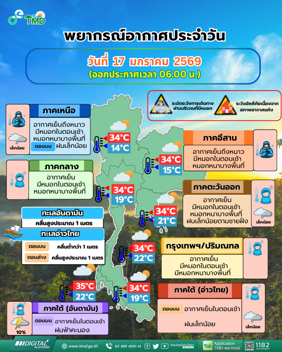 17 มกราคม 2569 พยากรณ์อากาศ 24 ชั่วโมงข้างหน้า ประเทศไทยมีอากาศเย็นกับมีหมอกในตอนเช้า และมีหมอกหนาบางพื้นที่ แต่ยังคงมีอากาศเย็นถึงหนาวในภาคเหนือ และภาคตะวันออกเฉียงเหนือตอนบน เนื่องจากบริเวณความกดอากาศสูงหรือมวลอากาศเย็นกำลังอ่อนปกคลุมประเทศไทยตอนบน ในขณะที่ลมฝ่ายตะวันตกจากประเทศเมียนมาเคลื่อนเข้าปกคลุมภาคเหนือตอนบนและลาวตอนบน ประกอบกับมีลมตะวันออกเฉียงใต้พัดนำความชื้นเข้ามาปกคลุมภาคตะวันออก ทำให้บริเวณดังกล่าวมีฝนเล็กน้อยบางแห่ง ขอให้ประชาชนดูแลรักษาสุขภาพเนื่องจากสภาพอากาศที่เปลี่ยนแปลง และเพิ่มความระมัดระวังในการสัญจรผ่านบริเวณที่มีหมอก รวมทั้งระวังอันตรายจากอัคคีภัยเนื่องจากสภาพอากาศแห้งไว้ด้วย