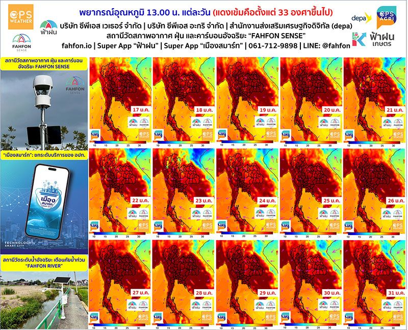 โดยระบุว่า อุณหภูมิตอนบ่ายโมง 17-31 ม.ค. ! แดงเข้มคือตั้งแต่ 33 องศาเซลเซียสขึ้นไป รูปนี้แสดงพยากรณ์อุณหภูมิ 13.00 น. ของแต่ละวัน