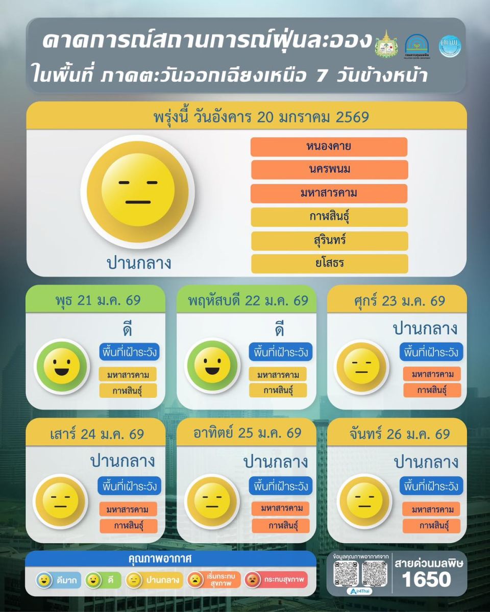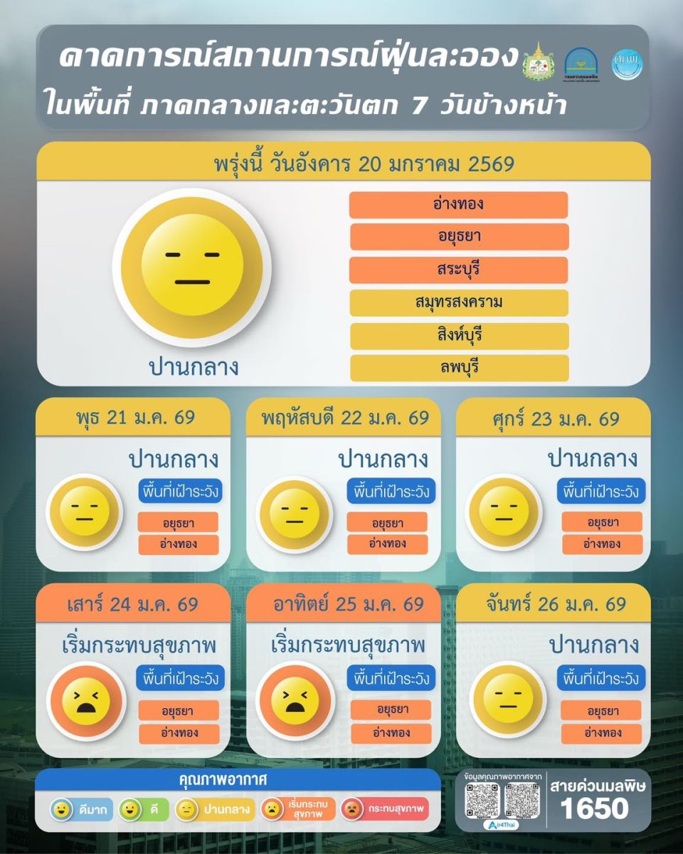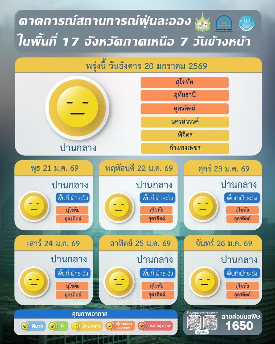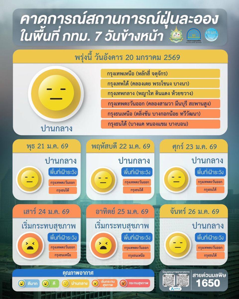 ผลการคาดการณ์สถานการณ์ฝุ่นละออง 7 วันข้างหน้า ระหว่างวันที่ 20 – 26 ม.ค.2569