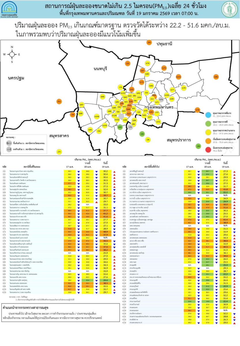 เมื่อวันที่ 19 ม.ค.2569 ศูนย์สื่อสารการแก้ไขปัญหามลพิษทางอากาศ รายงานการติดตามตรวจสอบคุณภาพอากาศประจำวันที่ 19 ม.ค.2569 ณ 07:00 น. สรุปดังนี้