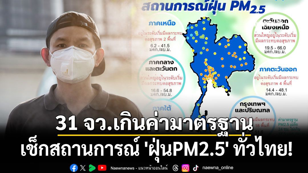 เช็กสถานการณ์ 'ฝุ่นPM2.5' ทั่วไทย! พบ 31 จังหวัดเกินค่ามาตรฐาน ขณะที่อีก 7 วันข้างหน้ายังพุ่งอีก