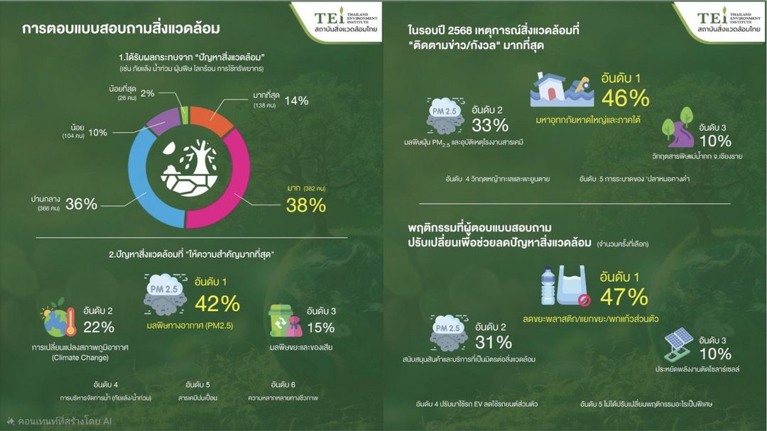 ผอ.TEI กล่าวต่อว่า ทั้งนี้ สถาบันสิ่งแวดล้อมไทย (TEI) ได้ทำการสำรวจ “เสียงคนไทย 2568: วิกฤตสิ่งแวดล้อมที่ต้องเร่งแก้!” จำนวนมากกว่าหนึ่งพันคนทั่วประเทศ พบว่า กว่า 88% ของประชาชน ได้รับผลกระทบจากปัญหาสิ่งแวดล้อมในระดับปานกลางถึงรุนแรง ทั้งต่อสุขภาพ รายได้ และทรัพย์สิน โดยปัญหาสิ่งแวดล้อม 3 อันดับแรกที่คนส่วนใหญ่ให้ความสำคัญ ได้แก่ มลพิษทางอากาศ (PM2.5) 42% การเปลี่ยนแปลงสภาพภูมิอากาศ (Climate Change) 22% และมลพิษขยะและของเสีย 15% ขณะเดียวกัน คนส่วนใหญ่อยากให้พรรคการเมืองเร่งผลักดันนโยบายสิ่งแวดล้อม 3 อันดับแรก ได้แก่ กฎหมายอากาศสะอาด (Clean Air Act) การจัดการน้ำทั้งระบบ (แก้ผังเมือง/ป้องกันน้ำท่วม-แล้ง) การจัดการขยะครบวงจร (Zero Waste)