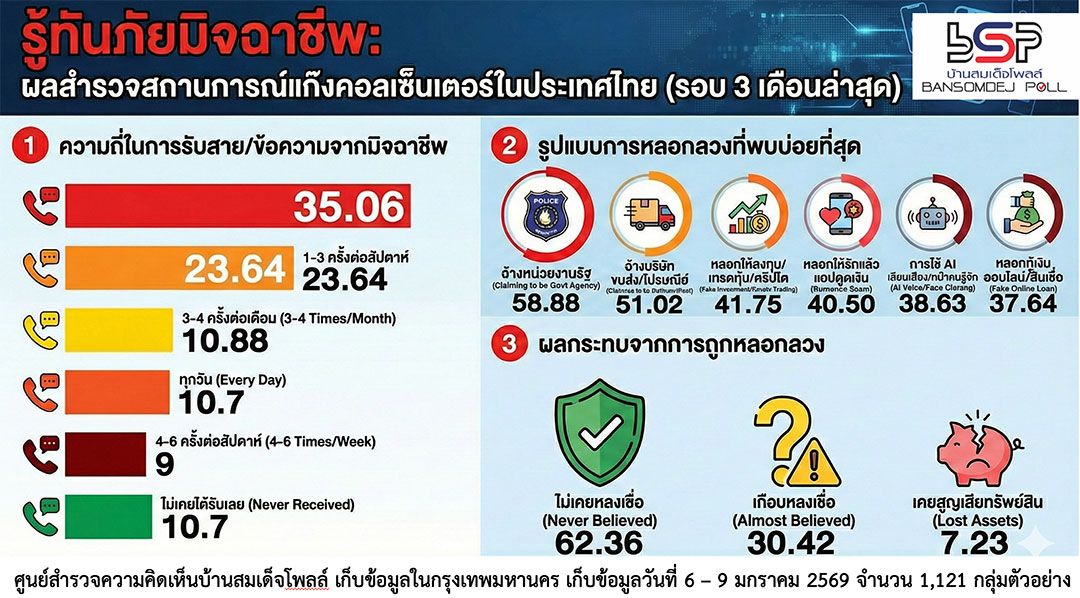 40.1% คน กทม.หวาดระแวง ไม่กล้ารับสายเบอร์แปลก เพราะแก๊งคอลเซ็นเตอร์ รูปแบบการหลอกลวงที่พบบ่อยที่สุด คือ อ้างหน่วยงานรัฐ