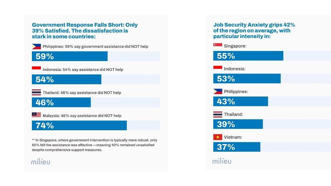 ด้านความเชื่อมั่นต่อภาครัฐ ผลสำรวจพบความไม่พึงพอใจต่อมาตรการช่วยเหลือในหลายประเทศ โดยชาวฟิลิปปินส์ 59% ระบุว่ามาตรการจากภาครัฐไม่ช่วยให้รับมือกับค่าครองชีพที่สูงขึ้นได้ ตามด้วย อินโดนีเซีย (54%) ไทยและมาเลเซีย (46%) และแม้แต่สิงคโปร์เองก็มีสัดส่วนผู้ไม่พึงพอใจถึง 40% ซึ่งชี้ ให้เห็นถึงช่องว่างระหว่าง “เป้าหมายของนโยบาย” กับ “ความจริงที่ประชาชนเผชิญ” ที่กำลังกว้างขึ้น และอาจส่งผลต่อความไว้วางใจในปี 2026 นี้เช่นกัน