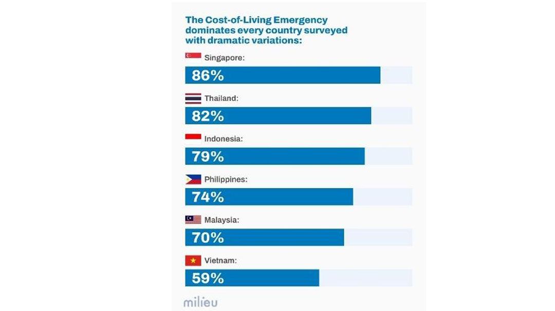 จากการสำรวจกลุ่มตัวอย่าง 3,000 คนในสิงคโปร์ ไทย มาเลเซีย อินโดนีเซีย เวียดนาม และฟิลิปปินส์ พบว่า “ค่าครองชีพ” เป็นความกังวลอันดับหนึ่งของประชาชนในปี 2025 โดยเฉลี่ย 75% ของผู้ตอบแบบสอบถามทั่วภูมิภาคระบุว่า ค่าครองชีพเป็นปัญหาระดับชาติ ทั้งนี้ สิงคโปร์มีสัดส่วน ความกังวลสูงที่สุดที่ 86% ตามด้วยไทย (82%) อินโดนีเซีย (79%) ฟิลิปปินส์ (74%) มาเลเซีย (70%) และเวียดนาม (59%)