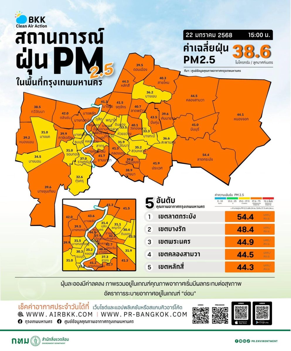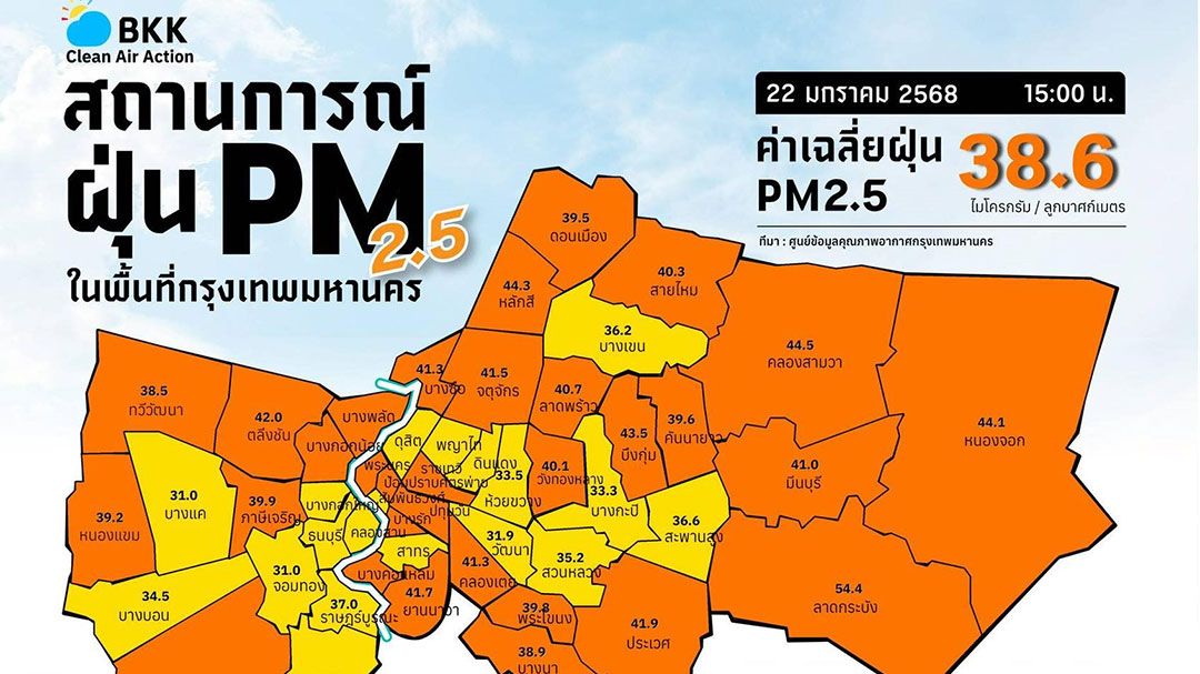 เมื่อวันที่ 22 มกราคมศูนย์สื่อสารการแก้ไขปัญหามลพิษทางอากาศ (ศกพ.) กรมควบคุมมลพิษ (คพ.) รายงานการติดตามตรวจสอบคุณภาพอากาศ ภาพรวมปริมาณฝุ่นละอองขนาดเล็กไม่เกิน 2.5 ไมครอน หรือ PM2.5 ในประเทศ ตรวจวัดค่าเฉลี่ย 24 ชั่วโมง อยู่ระหว่าง 8.5 – 65.8 ไมโครกรัม (มคก.)/ลูกบาศก์เมตร (ลบ.ม.) ค่ามาตรฐานไม่เกิน 37.5มคก./ลบ.ม.พบเกินค่ามาตรฐานใน 22 จังหวัด ได้แก่ กทม. จ.ปทุมธานี จ.นนทบุรี จ.สมุทรสาคร จ.สมุทรปราการ จ.ลำพูน จ.พิษณุโลก จ.กำแพงเพชร จ.อุทัยธานี จ.ชัยนาท จ.สิงห์บุรี จ.ลพบุรี จ.สระบุรี จ.อ่างทอง จ.สุพรรณบุรี จ.พระนครศรีอยุธยา จ.กาญจนบุรี จ.ราชบุรี จ.ปราจีนบุรี จ.สระแก้ว จ.ชลบุรี และ จ.นครราชสีมา