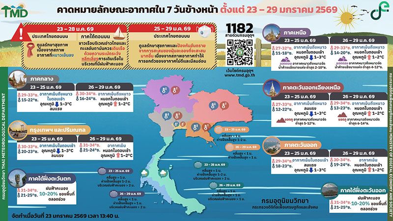 ในช่วงวันที่ 24 – 25 ม.ค. 69 ประเทศไทยตอนบนมีอากาศเย็นถึงหนาว โดยภาคกลางรวมทั้งกรุงเทพมหานครและปริมณฑลจะมีอุณหภูมิลดลง 1 - 2 องศาเซลเซียส เนื่องจากบริเวณความกดอากาศสูงหรือมวลอากาศเย็นกำลังค่อนข้างแรงระลอกใหม่จากประเทศจีนแผ่ลงมาปกคลุมประเทศไทยตอนบน ภาคใต้ตอนบน และทะเลจีนใต้ สำหรับภาคใต้จะมีฝนฟ้าคะนองบางแห่ง เนื่องจากมรสุมตะวันออกเฉียงเหนือที่พัดปกคลุมอ่าวไทย ภาคใต้ และทะเลอันดามันจะมีกำลังแรงขึ้นเป็นกำลังปานกลาง ส่วนคลื่นลมบริเวณอ่าวไทยและห่างฝั่งทะเลอันดามันจะมีกำลังแรงขึ้น โดยอ่าวไทยตอนล่างมีคลื่นสูงประมาณ 2 เมตร อ่าวไทยตอนบนและห่างฝั่งทะเลอันดามันคลื่นสูง 1 – 2 เมตร บริเวณที่มีฝนฟ้าคะนองคลื่นสูงมากกว่า 2 เมตร