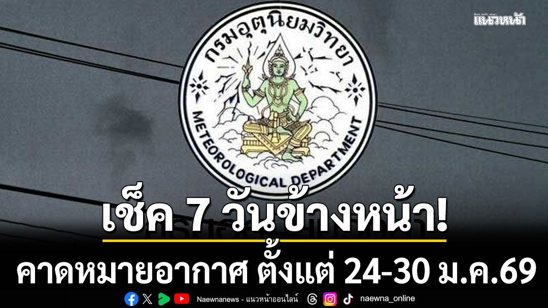 เมื่อเวลา 12.00 น. วันที่ 24 มกราคม 2569 กรมอุตุนิยมวิทยา คาดหมายอากาศทั่วไป พยากรณ์อากาศ 7 วันข้างหน้า ระหว่างวันที่ 24 - 30 มกราคม 2569 ดังนี้