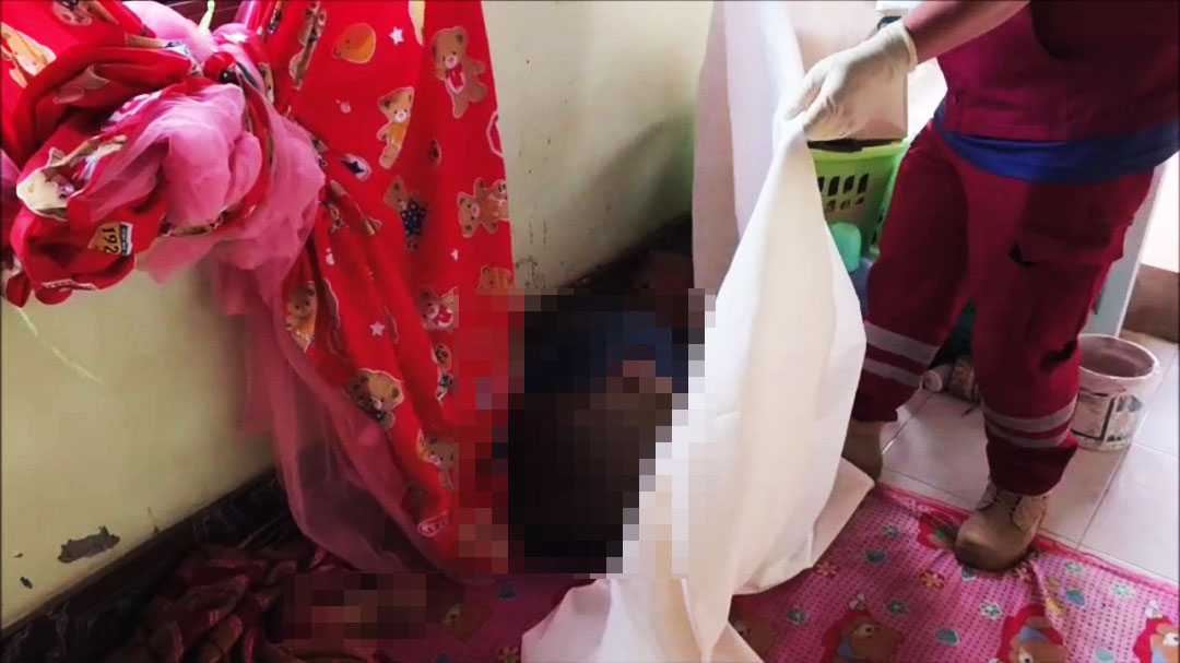 ภายในบ้านไม้สองชั้น เจ้าหน้าที่พบศพ นางตัน อายุ 89 ปี เสียชีวิตในสภาพนอนตะแคงคุดคู้ มีผ้าห่มคลุมร่างไว้ ตรวจสอบพบบาดแผลถูกของมีคมแทงที่ลำคอ 2 แผล คาดว่าเสียชีวิตมาแล้วประมาณ 5-7 ชั่วโมง (ช่วงเวลา 00.00-02.00 น.) ใกล้ศพพบมีดปอกผลไม้ตกอยู่จึงเก็บไว้เป็นหลักฐาน ส่วนผู้ก่อเหตุคือ นายเกียรติศักดิ์ หรือ ‘หำน้อย’ อายุ 44 ปี หลานชายแท้ๆ ของผู้ตาย ยังคงหลบซ่อนตัวอยู่ในบ้าน เจ้าหน้าที่ต้องเข้าเกลี้ยกล่อมจนสามารถควบคุมตัวไว้ได้โดยไม่มีการขัดขืน