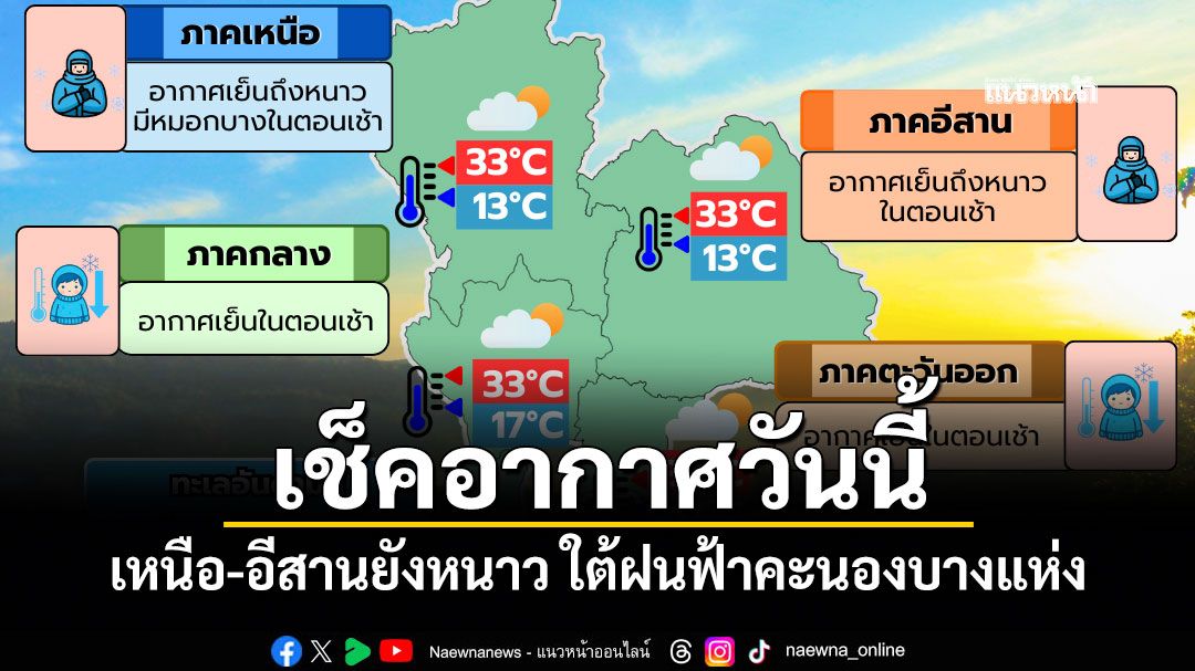 เมื่อวันที่ 25 มกราคม 2569 พยากรณ์อากาศประจำวัน ลักษณะอากาศทั่วไป พยากรณ์อากาศ 24 ชั่วโมงข้างหน้า ภาคเหนือและภาคตะวันออกเฉียงเหนือยังคงมีอากาศเย็นถึงหนาว สำหรับภาคกลางรวมทั้งกรุงเทพมหานครและปริมณฑล ภาคตะวันออก และภาคใต้ตอนบน มีอากาศเย็นในตอนเช้า เนื่องจากบริเวณความกดอากาศสูงหรือมวลอากาศเย็นกำลังค่อนข้างแรงที่ปกคลุมประเทศไทยตอนบนเริ่มมีกำลังอ่อนลง ขอให้ประชาชนดูแลรักษาสุขภาพเนื่องจากสภาพอากาศที่เปลี่ยนแปลงและอากาศที่หนาวเย็นลงไว้ด้วย