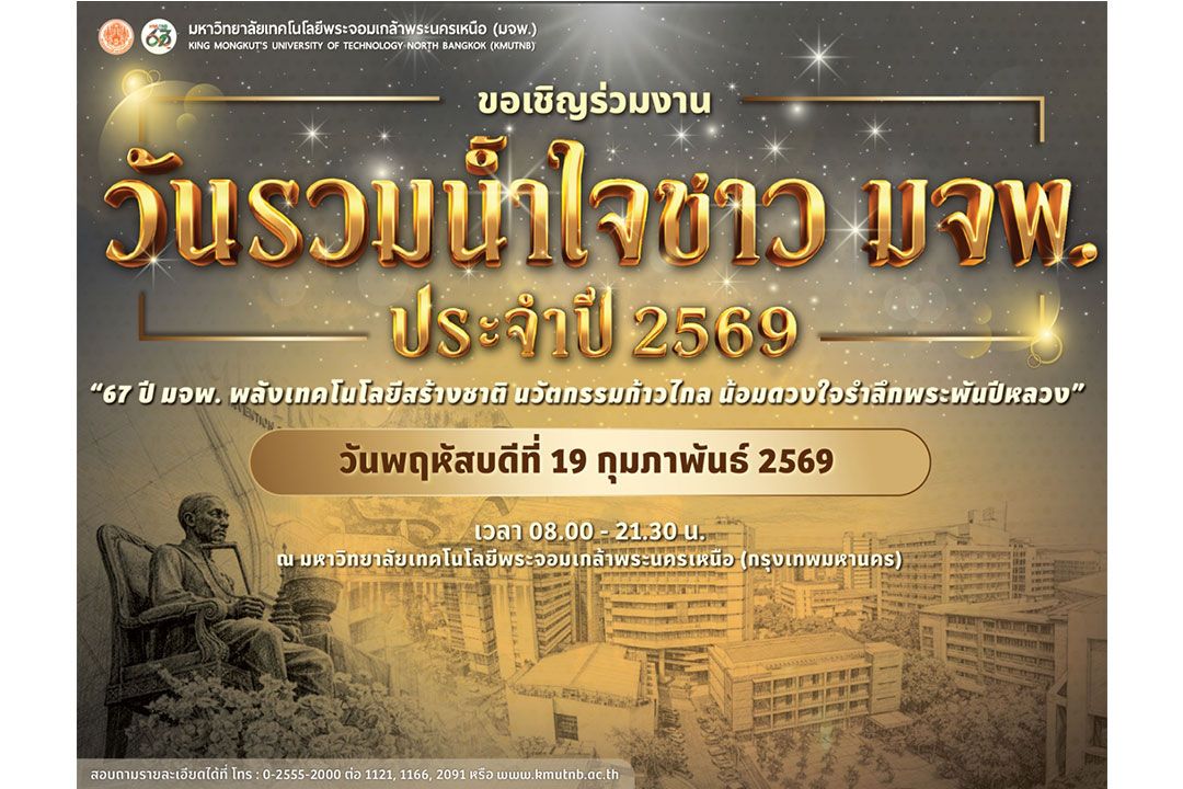 มจพ. ขอเชิญชวนคณาจารย์ บุคลากร ศิษย์เก่า ศิษย์ปัจจุบัน ผู้เกษียณอายุราชการ แขกผู้มีเกียรติ เครือข่ายความร่วมมือทางวิชาการ ร่วมงานวันรวมน้ำใจชาว มจพ. ประจำปี 2569 “67 ปี มจพ. พลังเทคโนโลยีสร้างชาติ นวัตกรรมก้าวไกล น้อมดวงใจรำลึกพระพันปีหลวง” ในวันพฤหัสบดีที่ 19 กุมภาพันธ์ 2569 เวลา 08.00-21.30 น. ณ มหาวิทยาลัยเทคโนโลยีพระจอมเกล้าพระนครเหนือ กรุงเทพฯ