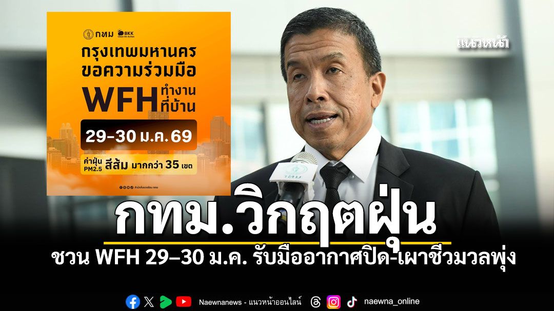นอกจากนี้ กรุงเทพมหานครขอความร่วมมือ Work From Home (WFH) ในวันที่ 29–30 มกราคม 2569 เนื่องจากคาดการณ์ว่าค่าฝุ่น PM2.5 จะอยู่ในระดับสีส้ม เริ่มมีผลกระทบต่อสุขภาพ ครอบคลุมมากกว่า 35 เขต พร้อมเชิญหน่วยงานภาครัฐและภาคเอกชนร่วมเป็นเครือข่าย WFH โดยสามารถลงทะเบียนผ่านลิงก์ https://u.bangkok.go.th/WFH2569