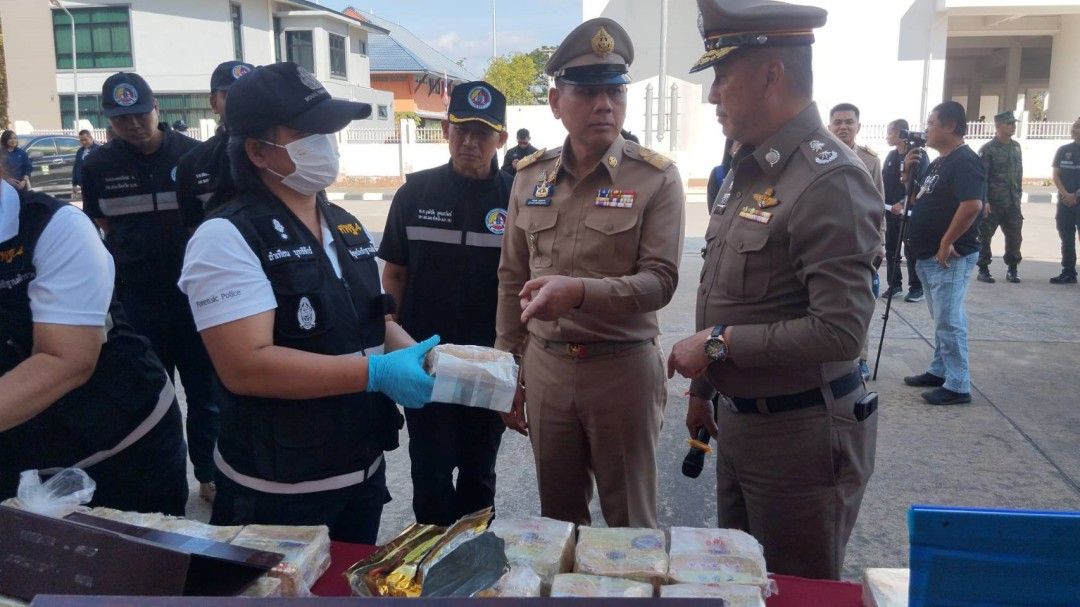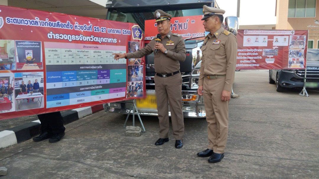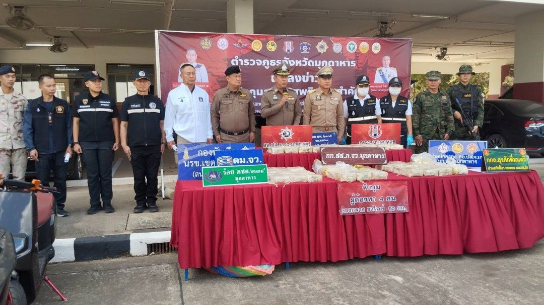 วันที่ 28 ม.ค. 2569 ผู้สื่อข่าวรายงานว่า พล.ต.ท. สันติ ชัยนิรามัย ผบช.ภ.4 พร้อมด้วยนายวรญาณ บุญณราช ผู้ว่าราชการจังหวัดมุกดาหาร และ พล.ต.ต. ไพโรจน์ ไทยพุทรา ผบก.ภ.จว.มุกดาหาร แถลงผลการจับกุมเครือข่ายยาเสพติดรายใหญ่ตามนโยบายสกัดกั้นยาเสพติดชายแดน