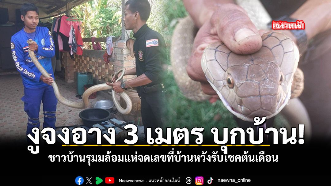 เมื่อเจ้าหน้าที่ไปถึงบ้านเลขที่ดังกล่าว ก็เข้าไปตรวจยังที่วางเครื่องซักผ้า เพื่อตรวจสอบ ก็พบมีงูจงอางตัวใหญ่ขดตัวอยู่ข้างเครื่องซักผ้า เมื่องูจงอางเห็น เจ้าหน้าที่ ก็ชูคอขึ้นขู่ทันที เจ้าหน้าที่จึงรีบใช้อุปกรณ์ในการจับงูเข้าทำการจับอย่างระมัดระวัง ซึ่งต่อมาเจ้าหน้าที่ก็สามารถจับหัวงูจงอางเอาไว้ได้นำมาวัดได้ความยาวถึง 3 เมตร จึงรีบนำใส่กระสอบ ก่อนจะนำไปคืนสู่ป่าธรรมชาติที่อยู่ห่างไกลบ้านเรือนผู้คนต่อไป แน่นอนชาวบ้านที่มามุงดูการจับงู ต่างก็นำเอาลขบ้านเลขที่มาเป็นเลขเด็ดสลากกินแบ่งรัฐบาลงวดวันที่ 1 ก.พ.นี้ คือเลข 112 121 211