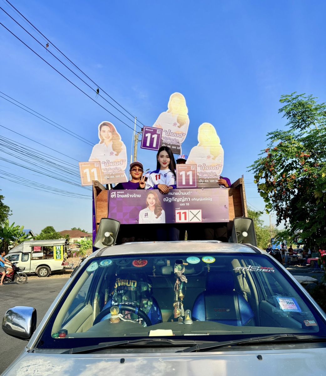 ในขณะเดียวกัน ‘ทนายน้ำมนต์’ น.ส.ณัฐกัญญ์ภา อภิญญ์มณีณัฐ หมายเลข 11 จากพรรคไทยสร้างไทย ได้ประกาศตัวเป็นทางเลือกใหม่ที่พร้อมทำงานทันที โดยชูสไตล์การหาเสียงแบบถึงลูกถึงคน ถือโทรโข่งเดินแนะนำตัวและรับฟังปัญหาประชาชนอย่างต่อเนื่อง