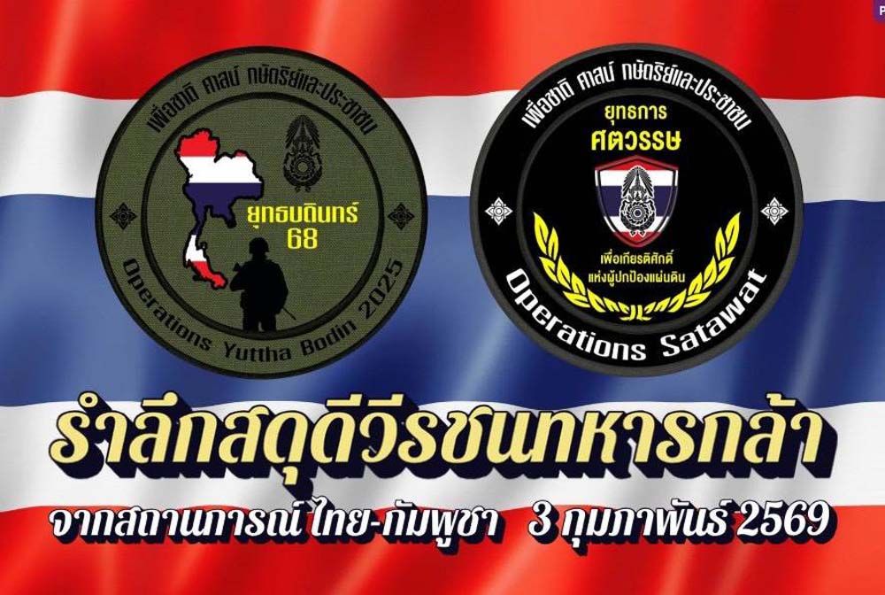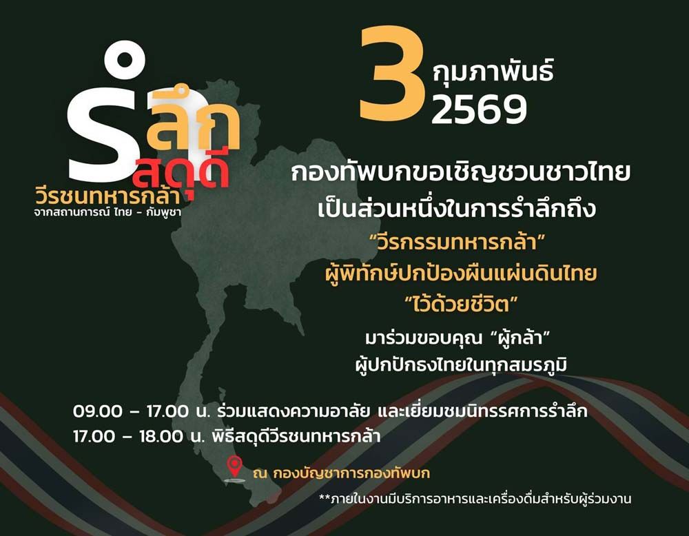 วันที่ 30 มกราคม 2569 กองทัพบกขอเชิญชวนพี่น้องประชาชนร่วมพิธี “รำลึกสดุดีวีรชนทหารกล้า” เพื่อร่วมรำลึกถึงทหารผู้เสียสละชีวิตในการปกป้องอธิปไตยของชาติ จากสถานการณ์ชายแดนไทย–กัมพูชา ในวันอังคารที่ 3 กุมภาพันธ์ 2569 ณ กองบัญชาการกองทัพบก ถนนราชดำเนินนอก กรุงเทพมหานคร โดยมี พลเอก พนา แคล้วปลอดทุกข์ ผู้บัญชาการทหารบก เป็นประธานในพิธี พร้อมด้วยญาติและครอบครัวของกำลังพลผู้เสียสละเข้าร่วมพิธี
