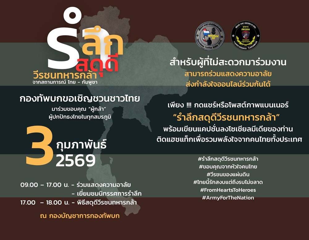 ทั้งนี้ ประชาชนที่ไม่สะดวกเดินทางมาร่วมงาน สามารถร่วมแสดงความอาลัยและส่งกำลังใจผ่านช่องทางออนไลน์ โดยการแชร์หรือโพสต์ภาพแบนเนอร์ “รำลึกสดุดีวีรชนทหารกล้า” พร้อมข้อความจากใจ และติดแฮชแท็ก #รำลึกสดุดีวีรชนทหารกล้า #ขอบคุณจากหัวใจคนไทย #วีรชนของแผ่นดิน #ไทยนี้รักสงบแต่ถึงรบไม่ขลาด #FromHeartsToHeroes #ArmyForTheNation #HeroesOfTheNation เพื่อร่วมกันส่งต่อพลังใจจากประชาชนไทยทั้งประเทศ สู่ครอบครัววีรชนและกำลังพลในแนวหน้า