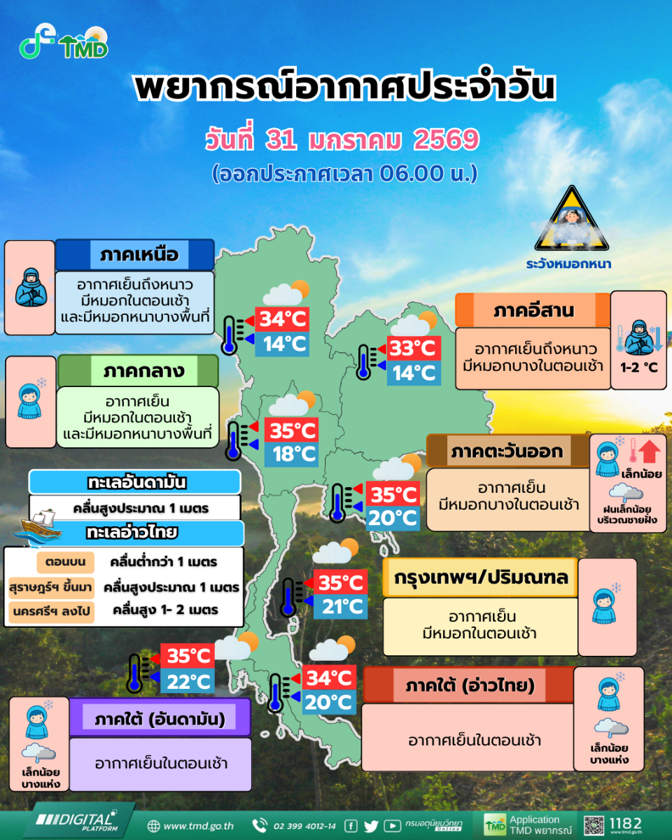 31 ม.ค.69 กรมอุตุนิยมวิทยา รายงานพยากรณ์อากาศ 24 ชั่วโมงข้างหน้า บริเวณความกดอากาศสูงหรือมวลอากาศเย็นกำลังปานกลางระลอกใหม่ได้แผ่ลงมาปกคลุมประเทศจีนตอนใต้แล้ว คาดว่าจะแผ่ปกคลุมถึงประเทศเวียดนามและลาวตอนบนภายในวันนี้ หลังจากนั้นจะแผ่ปกคลุมภาคตะวันออกเฉียงเหนือตอนบนต่อไป ทำให้ภาคตะวันออกเฉียงเหนือมีอุณหภูมิลดลง 1-2 องศาเซลเซียส และมีอากาศเย็นถึงหนาว ส่วนภาคอื่นๆ ยังคงมีอากาศเย็นถึงหนาวกับมีหมอกในตอนเช้า และมีหมอกหนาบางพื้นที่ โดยมีฝนเล็กน้อยบางแห่งในภาคตะวันออก ขอให้ประชาชนดูแลรักษาสุขภาพเนื่องจากสภาพอากาศที่เปลี่ยนแปลง รวมทั้งเพิ่มความระมัดระวังในการสัญจรผ่านบริเวณที่มีหมอกไว้ด้วย