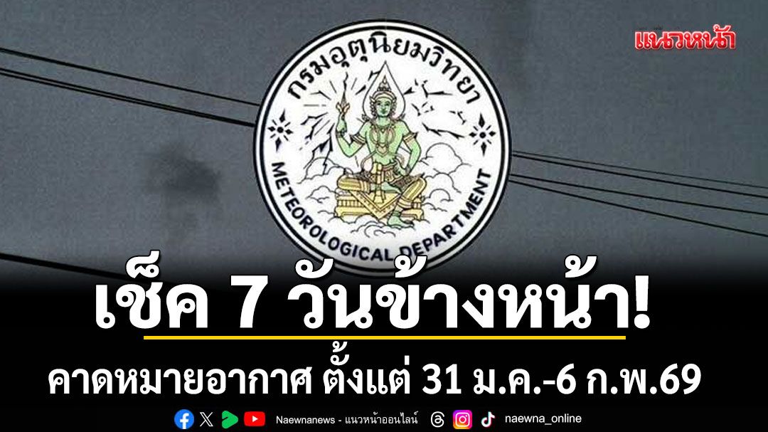 เมื่อเวลา 12.00 น. วันที่ 31 มกราคม 2569 กรมอุตุนิยมวิทยา คาดหมายอากาศทั่วไป พยากรณ์อากาศ 7 วันข้างหน้า ระหว่างวันที่ 31 มกราคม - 6 กุมภาพันธ์ 2569 ดังนี้