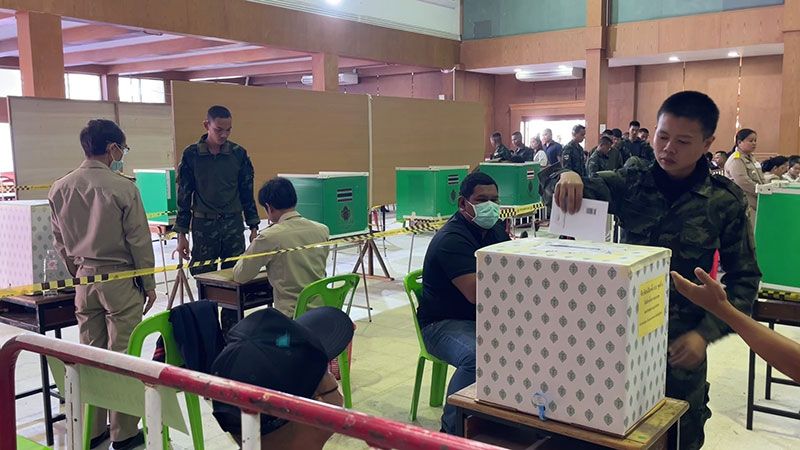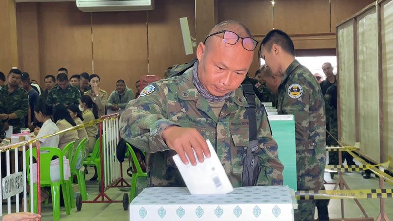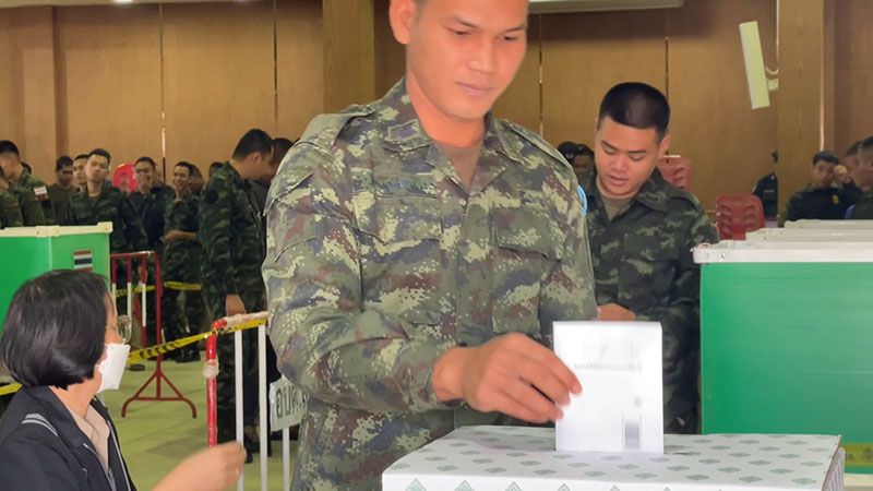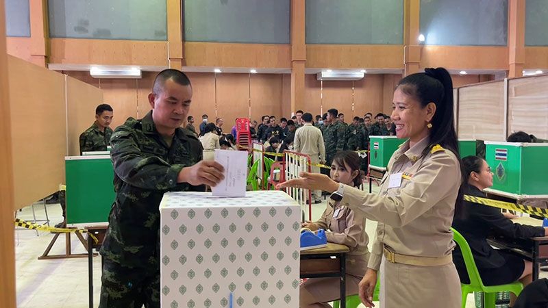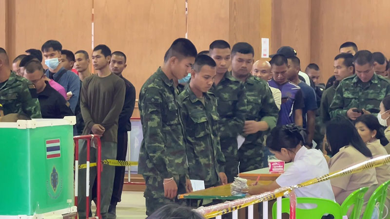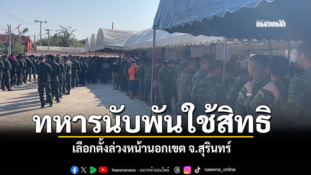 ทหารยืนต่อแถวยาวใช้สิทธิเลือกตั้งล่วงหน้านอกเขต บรรยากาศเป็นไปอย่างคึกคัก เขต 7 มีผู้ขอใช้สิทธิเลือกตั้งนอกเขตจำนวน 4,654 ราย กว่า 90 % เป็นทหารจากต่างจังหวัดทั่วประเทศ ที่มาประจำการอยู่ในพื้นที่จังหวัดสุรินทร์