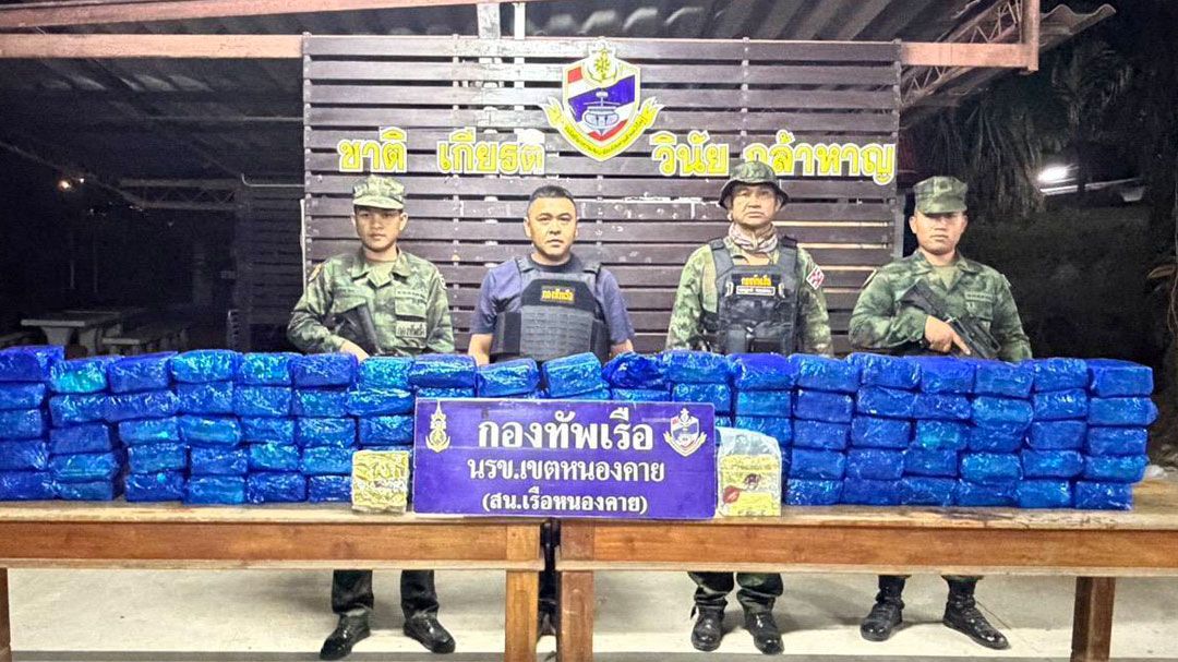 เมื่อวันที่ 1 ก.พ.2569 พล.ร.ต.ปารัช รัตนไชยพันธ์ โฆษกกองทัพเรือ เปิดเผยว่า กองทัพเรือ โดยหน่วยเรือรักษาความสงบเรียบร้อยตามลำแม่น้ำโขง (นรข.) ยังคงเดินหน้าบังคับใช้กฎหมายและรักษาความมั่นคงตามแนวชายแดนลุ่มน้ำโขงอย่างเข้มงวดและต่อเนื่อง เพื่อสกัดกั้นขบวนการลักลอบลำเลียงยาเสพติดข้ามชาติ โดยเมื่อคืน (1 ก.พ.2569) เวลาประมาณ 21.00 น. นรข.เขตหนองคาย ได้ลาดตระเวนและตรวจพบความเคลื่อนไหวต้องสงสัยบริเวณริมแม่น้ำโขง บ้านหินโงม ตำบลหินโงม อำเภอเมือง จังหวัดหนองคาย จึงเข้าดำเนินการตรวจสอบพื้นที่ ผลการปฏิบัติสามารถตรวจยึดยาเสพติดให้โทษประเภทที่ 1 (ยาไอซ์) จำนวน 3 กระสอบ น้ำหนักรวมประมาณ 100 กิโลกรัม มูลค่าเกือบ 100 ล้านบาท ขณะที่กลุ่มผู้กระทำความผิดได้อาศัยความมืดและความชำนาญพื้นที่หลบหนีไปได้ ภายหลังการตรวจยึด หน่วยฯ ได้นำของกลางทั้งหมดกลับไปยังสถานีเรือหนองคาย เพื่อดำเนินการตามขั้นตอนของกฎหมาย และขยายผลการสืบสวนร่วมกับหน่วยงานที่เกี่ยวข้องต่อไป