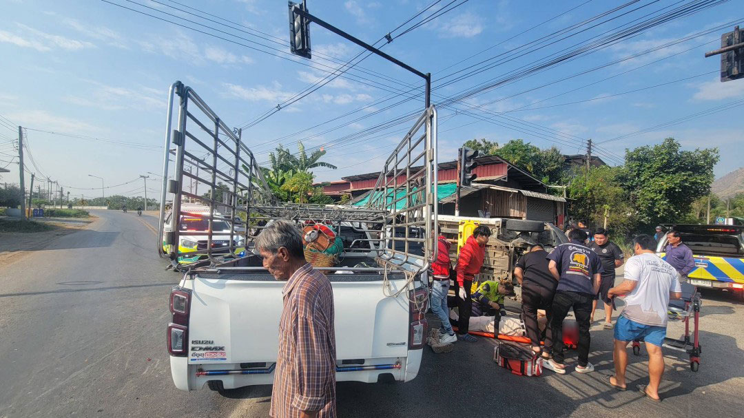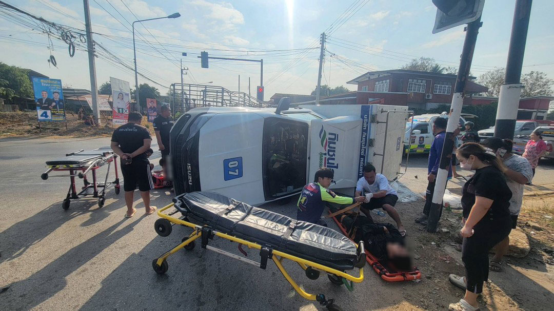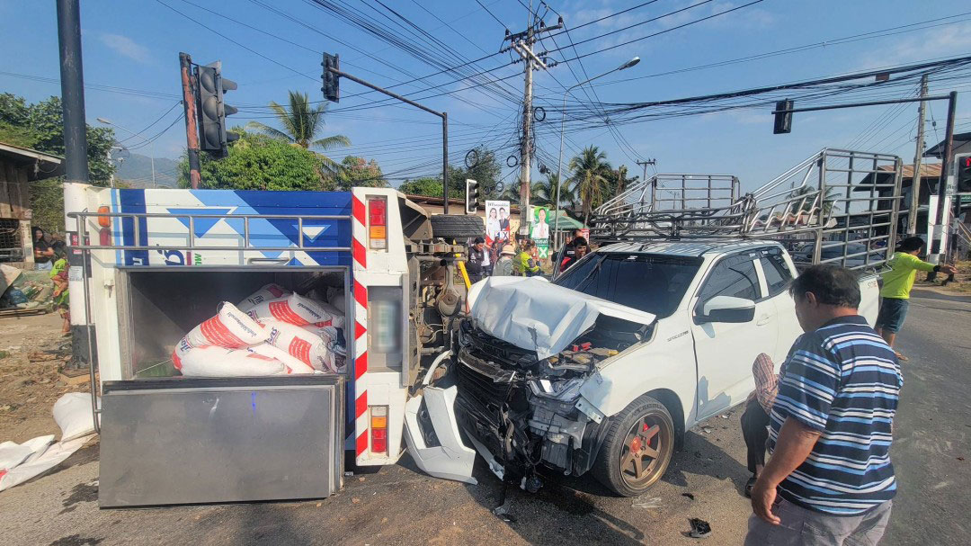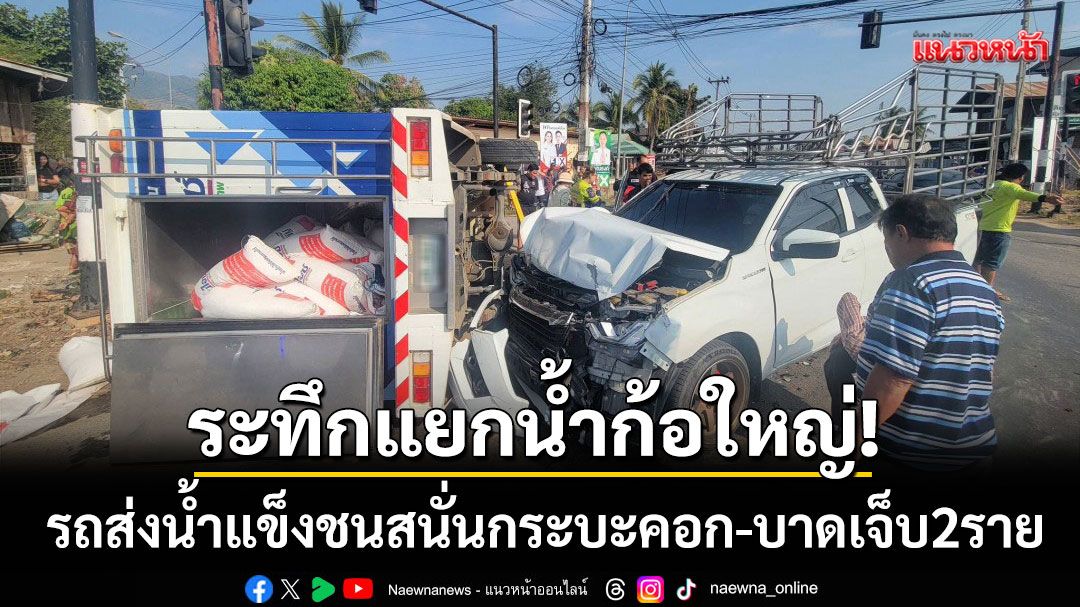 ระทึกแยกน้ำก้อใหญ่! กระบะตู้ทึบส่งน้ำแข็งชนสนั่นรถคอกเหล็ก-พลิกตะแคงกลางถนน