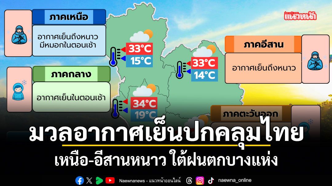 4 กุมภาพันธ์ 2569 พยากรณ์อากาศประจำวัน ลักษณะอากาศทั่วไป พยากรณ์อากาศ 24 ชั่วโมงข้างหน้า บริเวณความกดอากาศสูงหรือมวลอากาศเย็นกำลังปานกลางถึงค่อนข้างแรงยังคงปกคลุมประเทศไทยตอนบน ลักษณะเช่นนี้ ทำให้ภาคเหนือและภาคตะวันออกเฉียงเหนือ มีอากาศเย็นถึงหนาว ส่วนภาคกลางและภาคตะวันออก มีอากาศเย็นในตอนเช้า ขอให้ประชาชนดูแลรักษาสุขภาพเนื่องจากสภาพอากาศที่เปลี่ยนแปลงไว้ด้วย