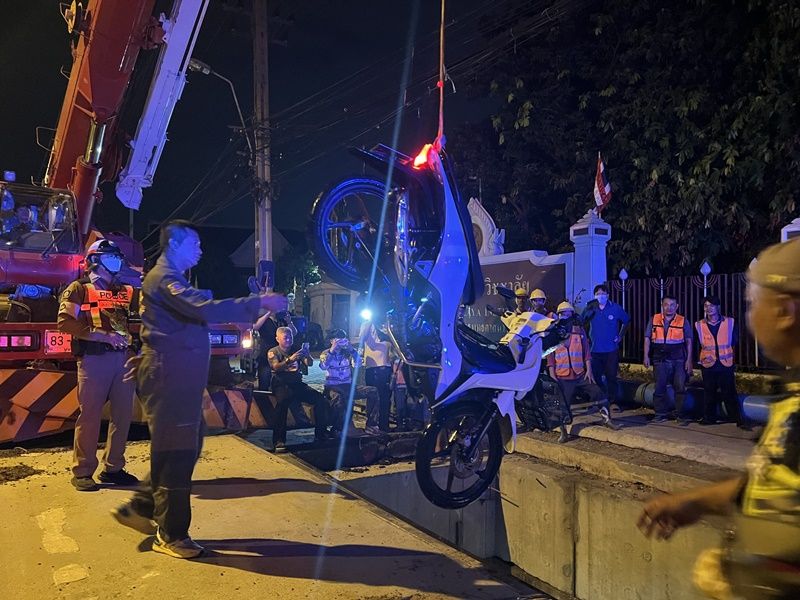 เมื่อเวลา 23.00 น.คืนวันที่ 3 กุมภาพันธ์ 2569 มูลนิธิร่วมกตัญญูได้รับแจ้งเหตุสุดระทึก มีรถจักรยานยนต์พุ่งตกลงไปในบ่อท่อร้อยสายไฟลึกกว่า 10 เมตร บริเวณถนนติวานนท์ หน้าวัดชลประทานรังสฤษดิ์ ที่เกิดเหตุเป็นจุดที่รถเครนกำลังเปิดฝาบ่อคอนกรีตเพื่อทำงาน โดยมีน้ำท่วมขังลึกถึง 2.5 เมตร
