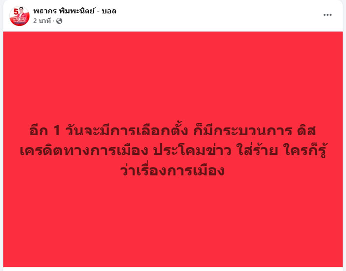 ขณะที่ล่าสุด นายพลากร ได้โพสต์ข้อความผ่านเฟซบุ๊ก ระบุว่า "อีก 1 วันจะมีการเลือกตั้ง ก็มีกระบวนการ ดิสเครดิตทางการเมือง ประโคมข่าว ใส่ร้าย ใครก็รู้ว่าเรื่องการเมือง"