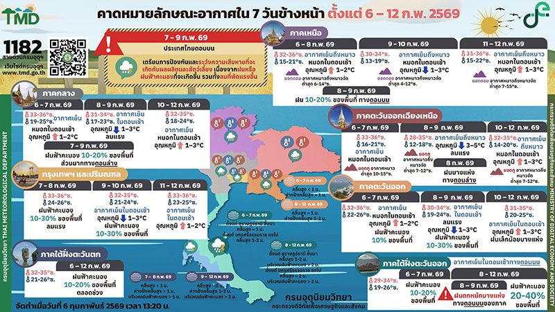 คาดหมายอากาศรายภาค 6 - 12 กุมภาพันธ์ พ.ศ. 2569