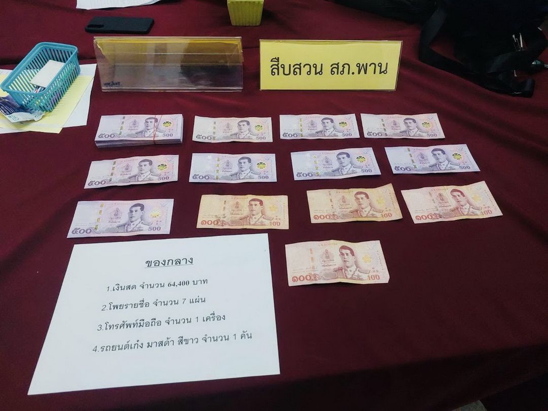 จากการตรวจค้นภายในรถ เจ้าหน้าที่พบของกลางสำคัญประกอบด้วย ธนบัตรใบละ 500 บาท จำนวน 128 ใบ และใบละ 100 บาท 4 ใบ รวมเป็นเงิน 64,400 บาท , เอกสารจำนวน 7 แผ่น ระบุชื่อ-นามสกุล และบ้านเลขที่ชาวบ้านรวม 124 ราย และโทรศัพท์มือถือ จำนวน 1 เครื่อง ใช้สำหรับติดต่อประสานงาน