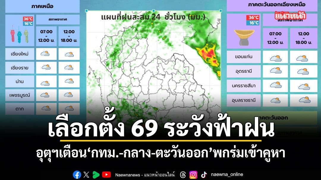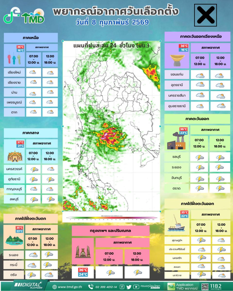 8 กุมภาพันธ์ 2569 พยากรณ์อากาศเพื่อการเลือกตั้ง สำหรับการเลือกตั้งสมาชิกสภาผู้แทนของประเทศไทย ในวันที่ 8 ก.พ.69 บริเวณความกดอากาศสูงหรือมวลอากาศเย็นกำลังปานกลางถึงค่อนข้างแรงระลอกใหม่จากประเทศจีนได้แผ่ลงมาปกคลุมประเทศจีนตอนใต้ และประเทศเวียดนามตอนบนแล้ว คาดว่าจะแผ่ลงมาปกคลุมประเทศลาวตอนบน ภาคตะวันออกเฉียงเหนือตอนบน และทะเลจีนใต้ ในวันนี้ (8 ก.พ.69) ลักษณะเช่นนี้ทำให้ภาคตะวันออกเฉียงเหนือมีลมแรง และอุณหภูมิลดลง 1-3 องศาเซลเซียส ในขณะที่มีลมใต้และลมตะวันออกเฉียงใต้พัดนำความชื้นจากทะเลจีนใต้และอ่าวไทยเข้ามาปกคลุมภาคกลาง รวมทั้งกรุงเทพมหานครและปริมณฑล และภาคตะวันออก ทำให้บริเวณดังกล่าวมีฝนฟ้าคะนองบางแห่งเกิดขึ้นได้ สำหรับภาคใต้ยังคงมีฝนฟ้าคะนองบางแห่ง เนื่องจากมรสุมตะวันออกเฉียงเหนือพัดปกคลุมอ่าวไทยและภาคใต้ ส่วนคลื่นลมบริเวณอ่าวไทยตอนล่างมีกำลังปานกลาง โดยมีคลื่นสูง 1-2 เมตร บริเวณที่มีฝนฟ้าคะนองคลื่นสูงมากกว่า 2 เมตร