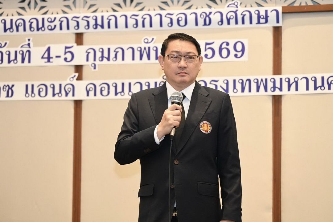 นายวิทวัต ปัญจมะวัต รองเลขาธิการ กอศ. กล่าวว่า นโยบายการจัดการอาชีวศึกษาระบบทวิภาคี ปีงบประมาณ พ.ศ. 2569 นี้ มีเป้าหมายแนวทาง 4 ข้อ ได้แก่ 1.การเตรียมตัวผู้เรียนอาชีวศึกษาทวิภาคีก่อนไปฝึกประสบการณ์วิชาขีพในสถานประกอบการ โดยพัฒนาทั้งความรู้ ทักษะ และระเบียบวินัย รวมไปถึงทักษะที่จำเป็นในสถานประกอบการ โดยอบรมอย่างน้อย 30 ชั่วโมง และเริ่มพัฒนาตั้งแต่บัดนี้ เพื่อจะได้มีความพร้อมที่ผู้เรียนจะออกไปฝึกประสบการณ์วิชาชีพในช่วงเดือนพฤษภาคม 2569 นี้ , 2.การวิเทศผู้เรียนที่ออกฝึกประสบการณ์วิชาชีพ ครูผู้สอนสามารถทำได้ทั้งแบบ Onsite และแบบ Online ซึ่งควรวิเทศ อย่างน้อยสัปดาห์ละ 2 ครั้ง , 3.สถานศึกษาจะต้องจัดทำportfolioให้ผู้เรียนได้นำไปให้สถานประกอบการ เพื่อประเมินผลการฝึกประสบการณ์วิชาชีพของผู้เรียน โดยสถานประกอบการจะประเมินทั้งจุดแข็ง จุดอ่อนของผู้เรียน ถ้าหากผู้เรียนมีจุดอ่อนเรื่องใด สถานศึกษาจะต้องกลับมาพัฒนาสมรรถนะซ่อมเสริมเพิ่มเติมให้กับผู้เรียน โดยพัฒนา อย่างน้อย 30 ชั่วโมง เพื่อคุณภาพการจัดการอาชีวศึกษาทวิภาคี และ 4.การทำความร่วมมือกับการนิคมอุตสาหกรรมแห่งประเทศไทย โดยจัดพื้นที่รับผิดชอบ 1 สำนักงานอาชีวศึกษา (สอจ.) 1 นิคมอุตสาหกรรม รวมทั้งการจัดทำระบบจัดเก็บข้อมูลความต้องการกำลังคนสถานประกอบการ (ระบบ DVE - PPP Management System)เพื่อจัดทำเป็นระบบข้อมูลกลาง โดยขอความร่วมมือ สอจ.เป็นผู้รายงานและนำข้อมูลที่ผ่านมา เข้าสู่ระบบเป็นข้อมูลกลางเพื่อแชร์ข้อมูลร่วมกัน