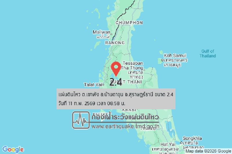 วันที่ 11 กุมภาพันธ์ 2569 กองเฝ้าระวังแผ่นดินไหว รายงานตรวจพบแผ่นดินไหว 2 ครั้ง เมื่อ เวลา 08.58 น. ต.เขาพัง อ.บ้านตาขุน จ.สุราษฎร์ธานี ขนาด 2.4 ความลึก 1 กิโลเมตร และ เมื่อเวลา 09.12 น. ต.เขาพัง อ.บ้านตาขุน จ.สุราษฎร์ธานี ขนาด 2.9 ความลึก 1 กิโลเมตร