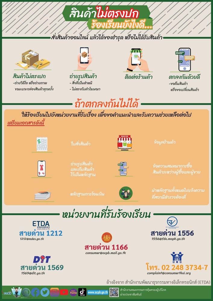 ขณะเดียวกัน กรณีที่ท่านได้ทำการโอนเงินและรับพัสดุมาแล้ว ขณะเปิดพัสดุ แนะนำให้ถ่ายคลิปวิดีโอไว้ทุกครั้ง เพื่อยืนยันสภาพสินค้าภายในว่าใช่ของท่านหรือไม่ สินค้าถูกต้องครบถ้วนหรือไม่ หากพบว่าสินค้าไม่ตรงปกหรือไม่ได้สั่งจริง สามารถติดต่อขอคืนเงินจากผู้ขายได้ทันที และหากไม่สามารถตกลงกันได้ ให้รวบรวมหลักฐาน ได้แก่ ใบสั่งซื้อ ภาพถ่ายสินค้าและบรรจุภัณฑ์ หลักฐานการโอนเงิน ข้อมูลร้านค้า และข้อความสนทนาระหว่างผู้ซื้อกับผู้ขาย เข้าแจ้งความที่สถานีตำรวจใกล้บ้าน หรือร้องเรียนขอคำแนะนำและความช่วยเหลือได้ที่ สายด่วน 1212, สายด่วน 1166, สายด่วน 1556, สายด่วน 1569 และหมายเลขโทรศัพท์ 02-248-3734-7 เพื่อป้องกันและลดความเสี่ยงจากกการถูกหลอกลวงทางออนไลน์