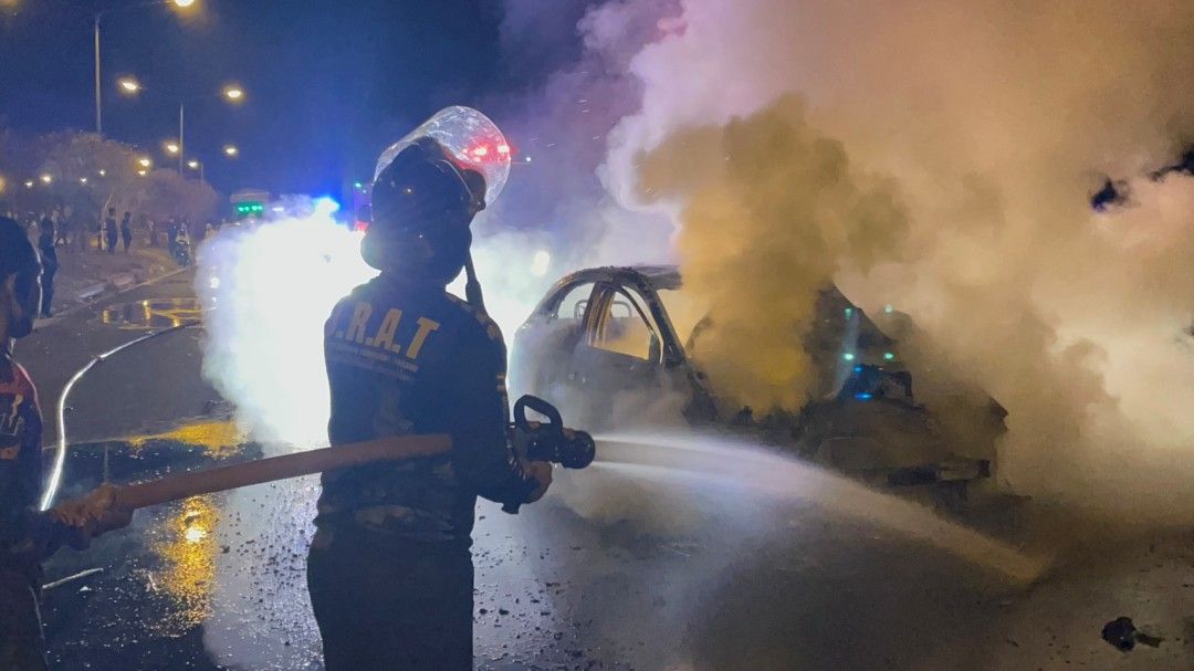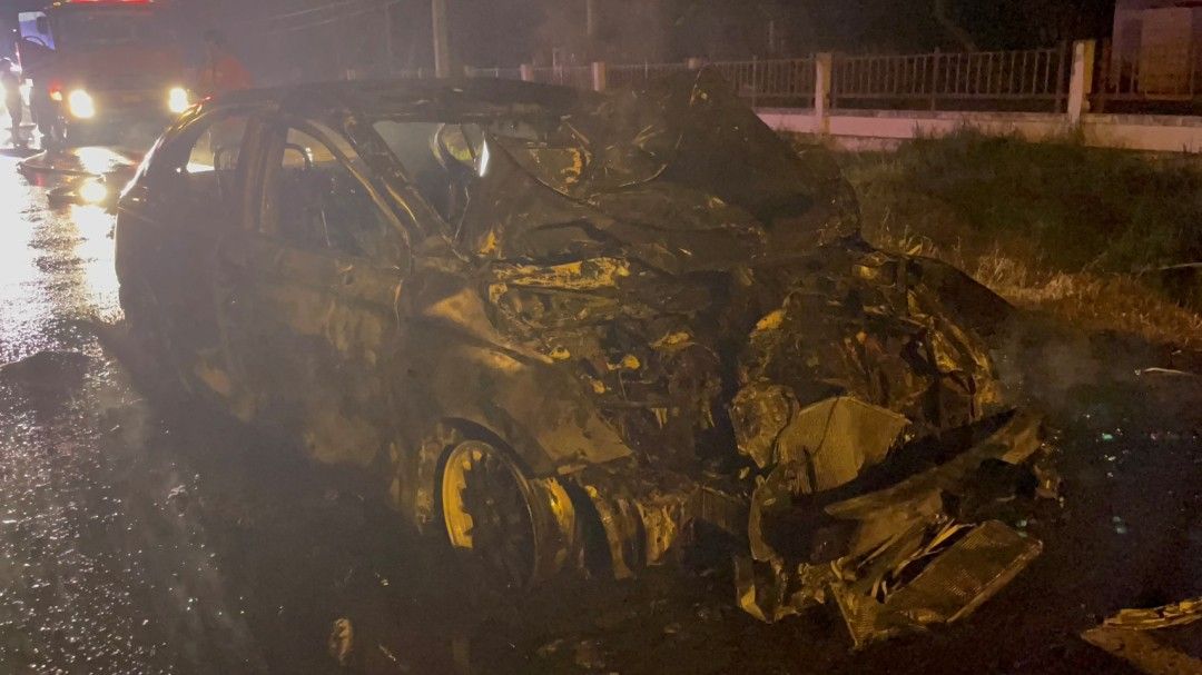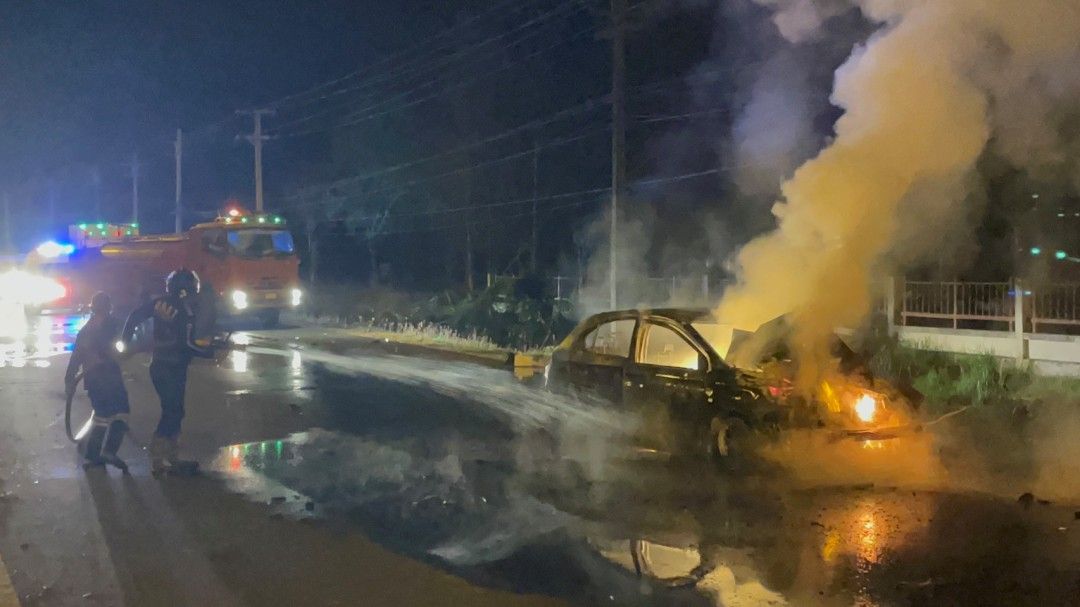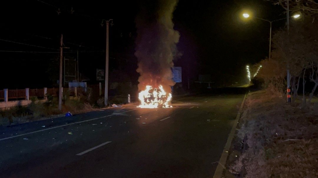 ที่เกิดเหตุ พบรถเก๋งสีขาว ทะเบียนสุรินทร์ สภาพพังยับเยินและถูกเพลิงลุกไหม้อย่างรุนแรง มีเสียงระเบิดดังออกมาเป็นระยะ เจ้าหน้าที่ต้องทำการปิดการจราจรชั่วคราวเพื่อความปลอดภัย และใช้เวลากว่า 40 นาทีจึงจะควบคุมเพลิงไว้ได้ ตรวจสอบเบื้องต้นพบรถวอดเสียหายทั้งคันพร้อมเอกสารสำคัญภายในรถ