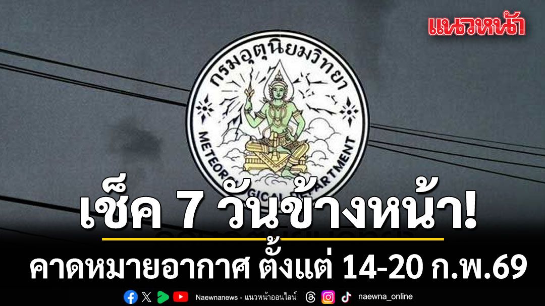 เมื่อเวลา 12.00 น. วันที่ 14 กุมภาพันธ์ 2569 กรมอุตุนิยมวิทยา คาดหมายอากาศทั่วไป พยากรณ์อากาศ 7 วันข้างหน้า ระหว่างวันที่ 14 กุมภาพันธ์ - 20 กุมภาพันธ์ 2569 ดังนี้