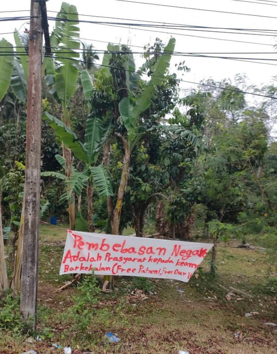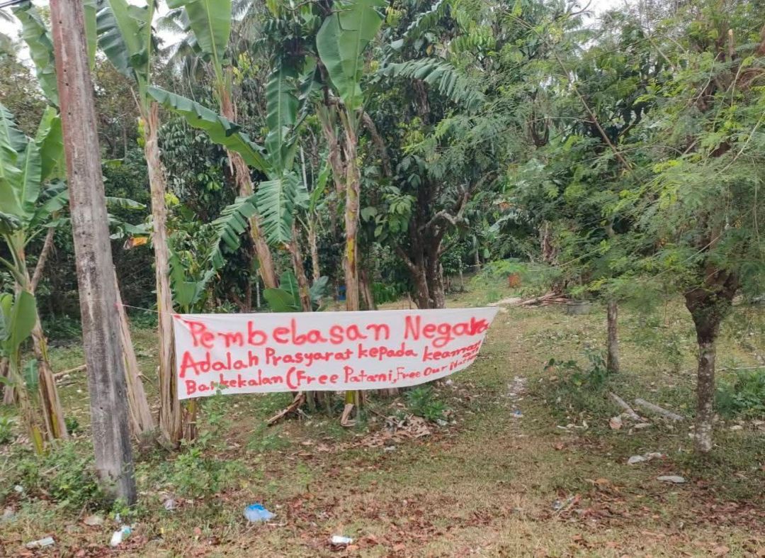 โดยว่าพบป้ายผ้ามีข้อความเขียนด้วยภาษาท้องถิ่นและภาษาอังกฤษ ใจความระบุว่า Pembebasan Negakc Adalah Prasyarat Kepada Keamg Barkelalan (Free Patani, Free our) (การปลดปล่อย/เอกราช คือเงื่อนไขเบื้องต้นสู่สันติภาพที่ยั่งยืน)